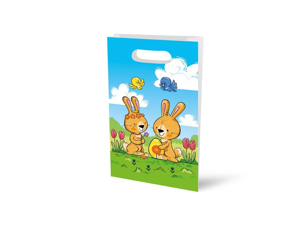 Veľkonočná papierová taška s potlačou veľkonočných zajačikov. Ideálna na vytváranie čokoládových balíčkov pre deti. Materiál: papier Uvedená cena je za 1 ks.Dodatočné parametre