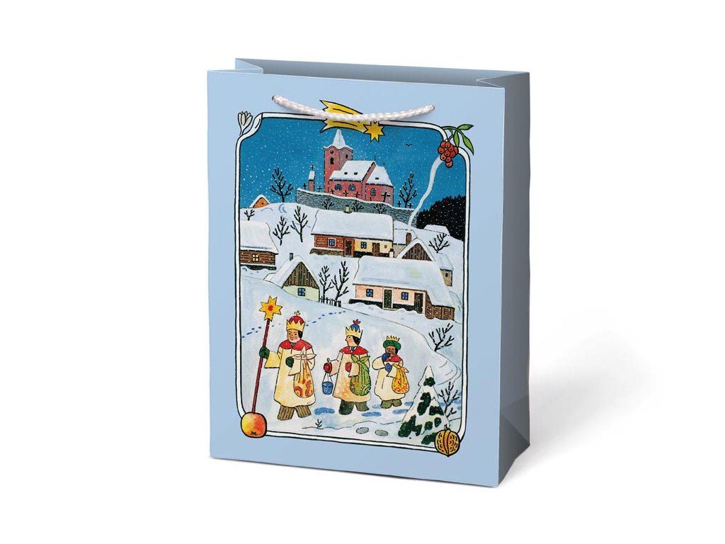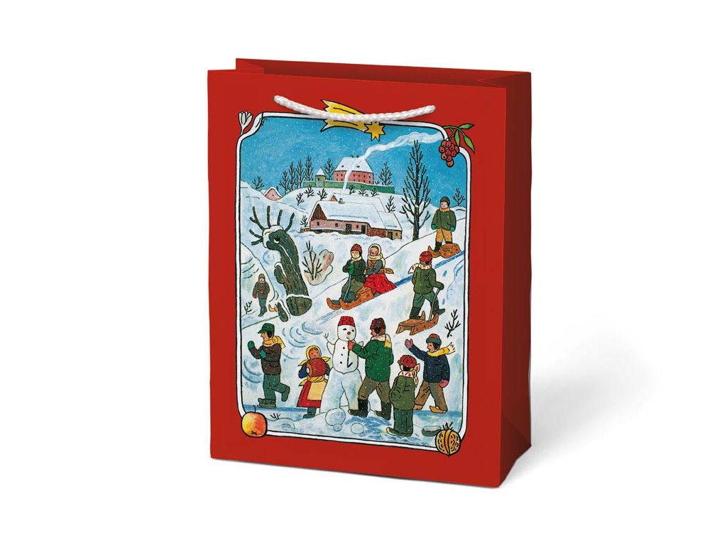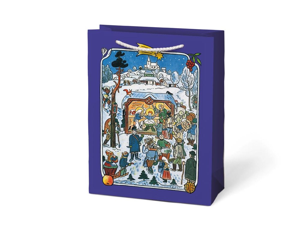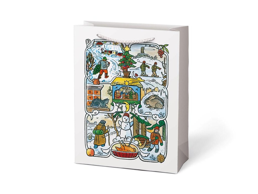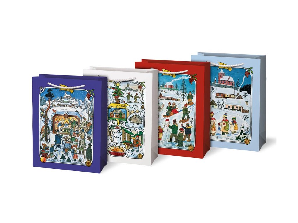 Vianočná, darčeková, papierová taška s vianočnými motívmi od Jozefa Ladu. Je ideálny na odovzdanie darčekov, ktoré je ťažké zabaliť do darčekového baliaceho papiera. Taška má pevné ucho pre ľahké prenášanie a štítok na vpísanie mena či priania. Rozmer: 190 x 250 x 90 mm Motív: mix vianočných motívov Dodávame v mixe 4 ks podľa skladovej zásoby. Uvedená cena je za 1 ks.Dodatočné parametre