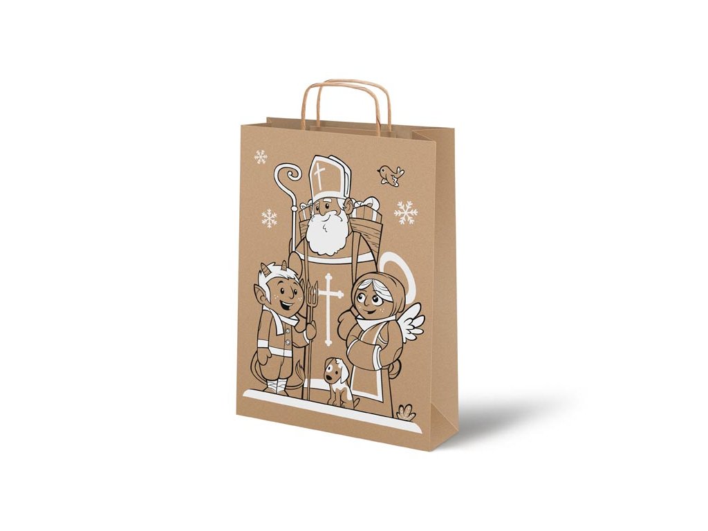 Darčeková, papierová taška s prehmatom a potlačou Mikuláša, anjela a čerta. Ideálna na vytváranie čokoládových balíčkov pre deti! Kartónové balenie: 300 ks Materiál: hnedý papier 70 g Rozmer: 220 x 280 x 100 mm Uvedená cena je za 1 ks.Dodatočné parametre