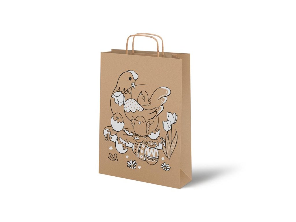 Veľkonočná darčeková taška s motívom sliepočky, kuriatok a veľkonočného vajíčka. Ideálne na veľkonočnú nádielku pre malých i veľkých koledníkov (šibačov – kúpačov). Materiál: hnedý papier 85 g Rozmer: 220 x 280 x 100 mm Uvedená cena je za 1 ks.Dodatočné parametre