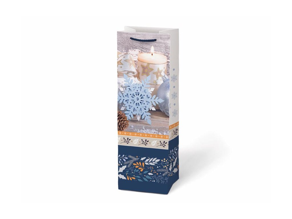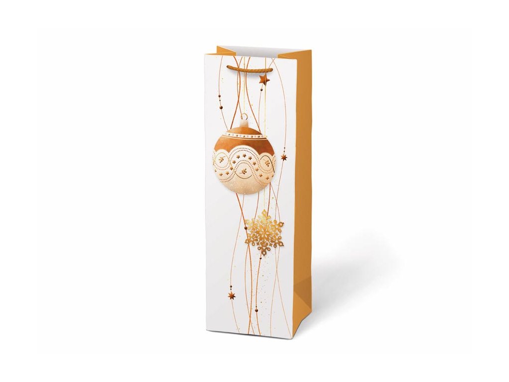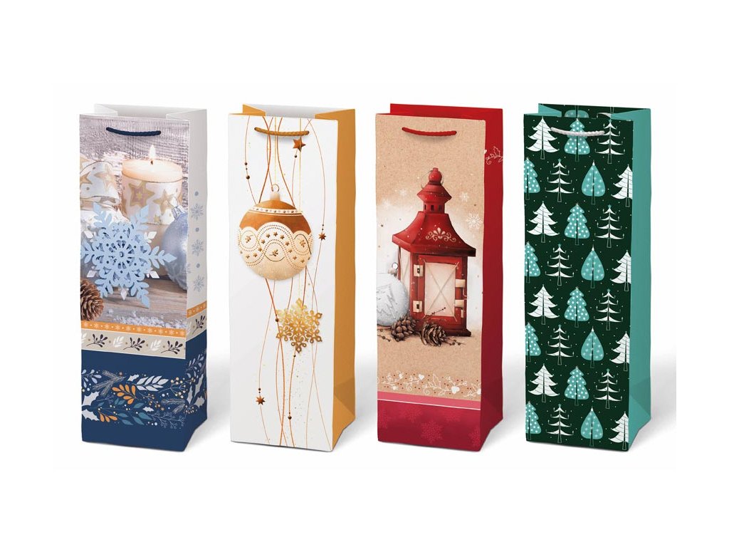 Vianočná, darčeková, papierová taška T12 je určená najmä na darovanie vína alebo iných zaujímavých fliaš. Rozmery: 125 x 365 x 90 mm Motív: zmes vianočných motívov Dodávame v mixe 4 kusov podľa skladových zásob. Uvedená cena je za 1 ks.Dodatočné parametre