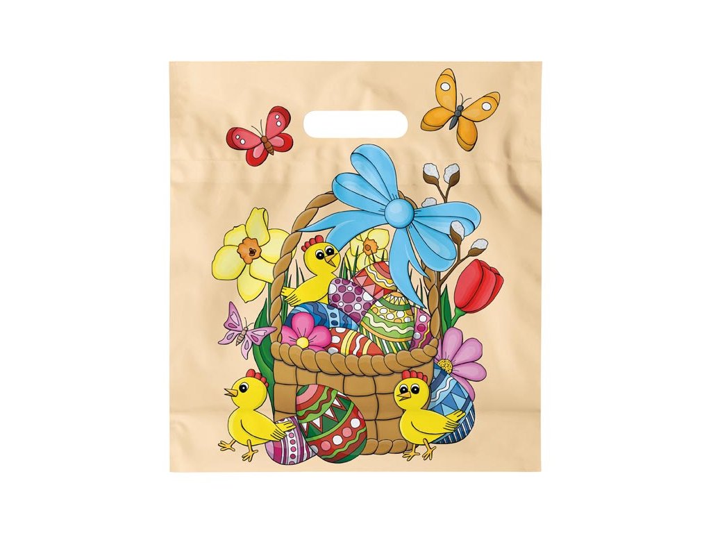 Veľkonočná, igelitová taška s potlačou. Ideálna pre vytváranie čokoládových balíčkov pre deti! Tlač: 4+0cmyk Materiál: Polyetylén Hrúbka materiálu: 0,045 my Rozmer: 290 x 320 x 80 mm Uvedená cena je za 1 ks.Dodatočné parametre