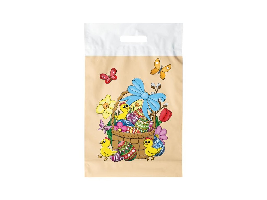 Veľkonočná, igelitová taška s potlačou. Ideálna pre vytváranie čokoládových balíčkov pre deti! Tlač: 4+0cmyk Materiál: Polyetylén Hrúbka materiálu: 0,045 my Rozmer: 290 x 460 x 80 mm Uvedená cena je za 1 ks.Dodatočné parametre