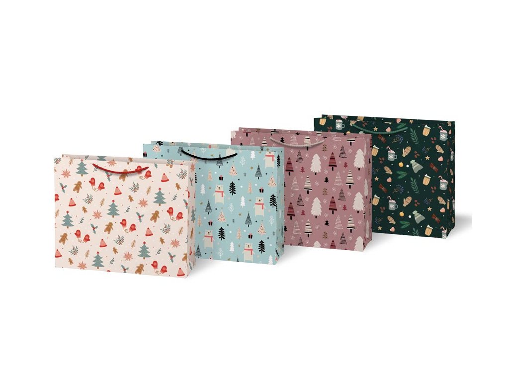Vianočná, darčeková, papierová taška, je ideálna na odovzdanie darčekov a veľkým pomocníkom, keď je ťažké darček zabaliť do darčekového baliaceho papiera. Taška je opatrená pevným uchom. Rozmer: 325 x 265 x 135 mm Motív: mix vianočných motívov Dodávame v mixe 4 ks podľa skladových zásob. Uvedená cena je za 1 ks.Dodatočné parametre