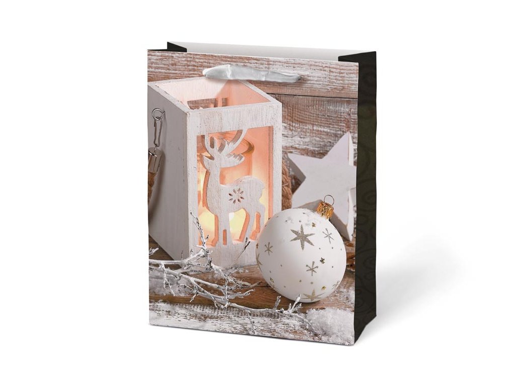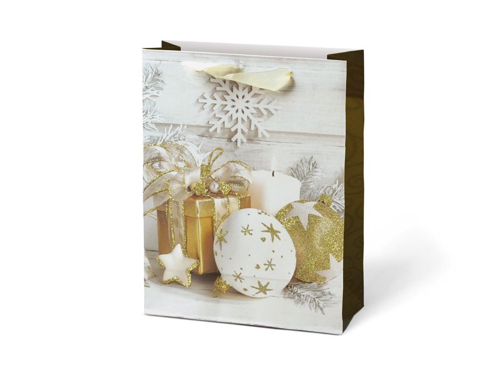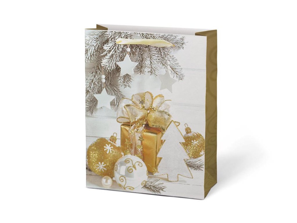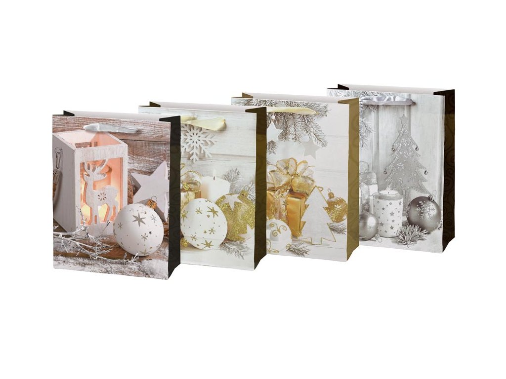 Vianočná, darčeková, papierová taška M LUX je ideálna na darovanie darčekov a je skvelým pomocníkom, keď je ťažké zabaliť darček do darčekového baliaceho papiera. Taška je vybavená pevnou rukoväťou. Rozmery: 180 x 240 x 85 mm Motív: mix vianočných motívov Dodáva sa v mixe 4 ks podľa skladových zásob. Uvedená cena je za 1 ks.Dodatočné parametre