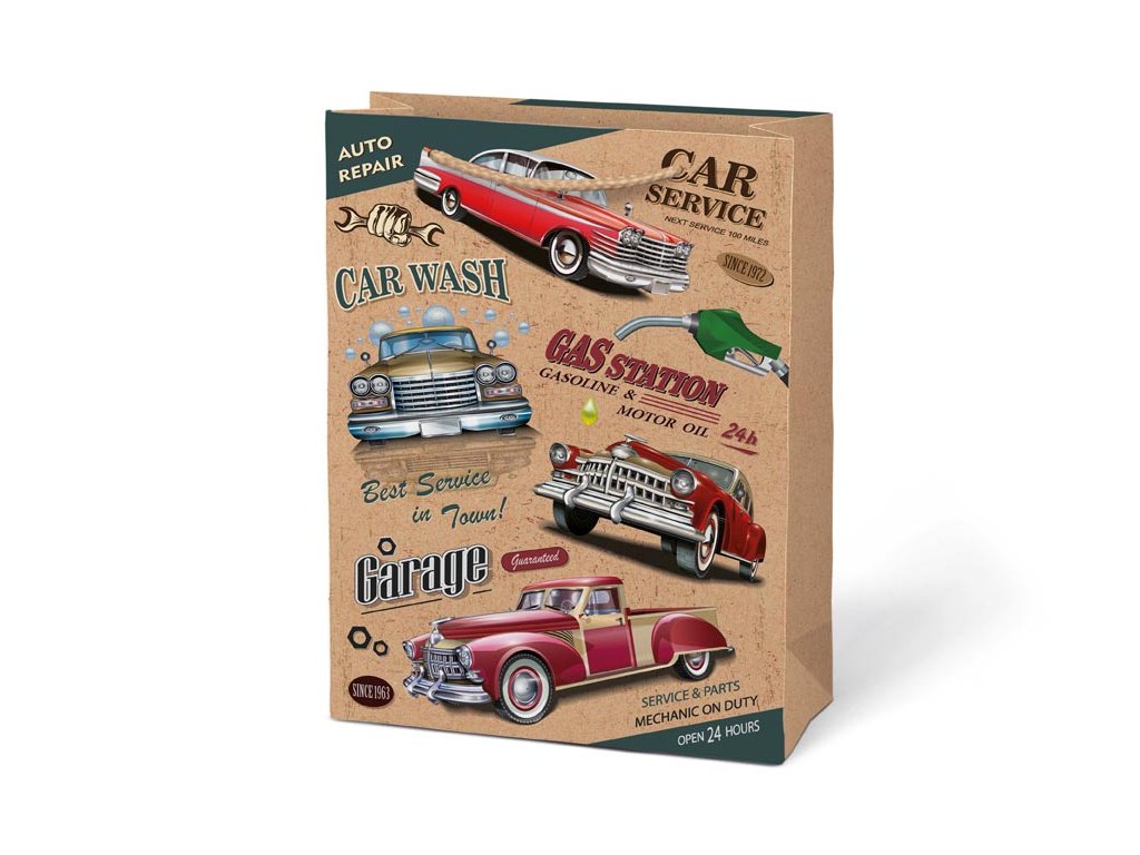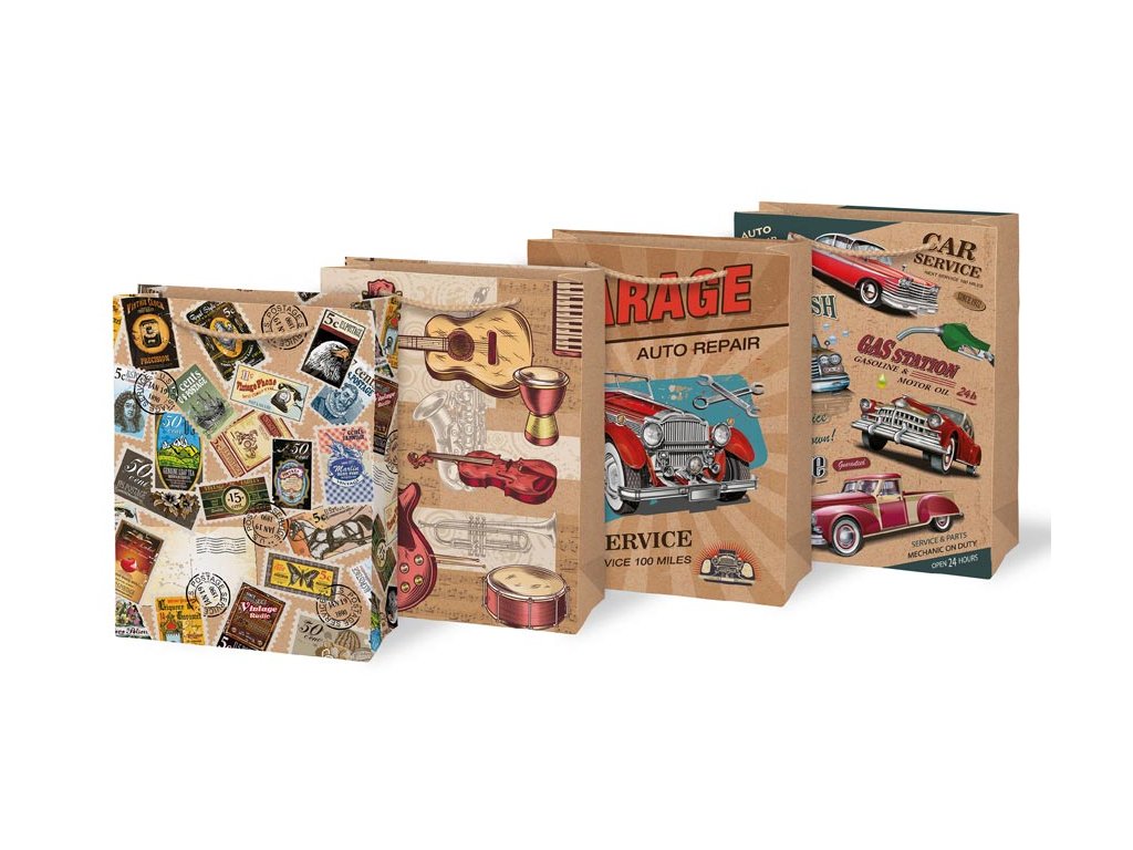 Papierová darčeková taška M KRAFT z pevného kraftového papiera s farebnou potlačou. Taška má pletené textilné uši a kartičku kam môžete napísať meno alebo krátke venovanie. Ak nemáte čas baliť darček do darčekového baliaceho papiera tak práve pre Vás máme široký výber darčekových tašiek. MOTIV: - známky - auto veterán - auto veteráni - hudobné nástroje Farba: hnedá/prírodná Materiál: kraftový papier Rozmer: 190 x 250 x 90 mm Dodávame v mixe po 4 ks podľa skladovej zásoby. Uvedená cena je za 1 ks.Dodatočné parametre