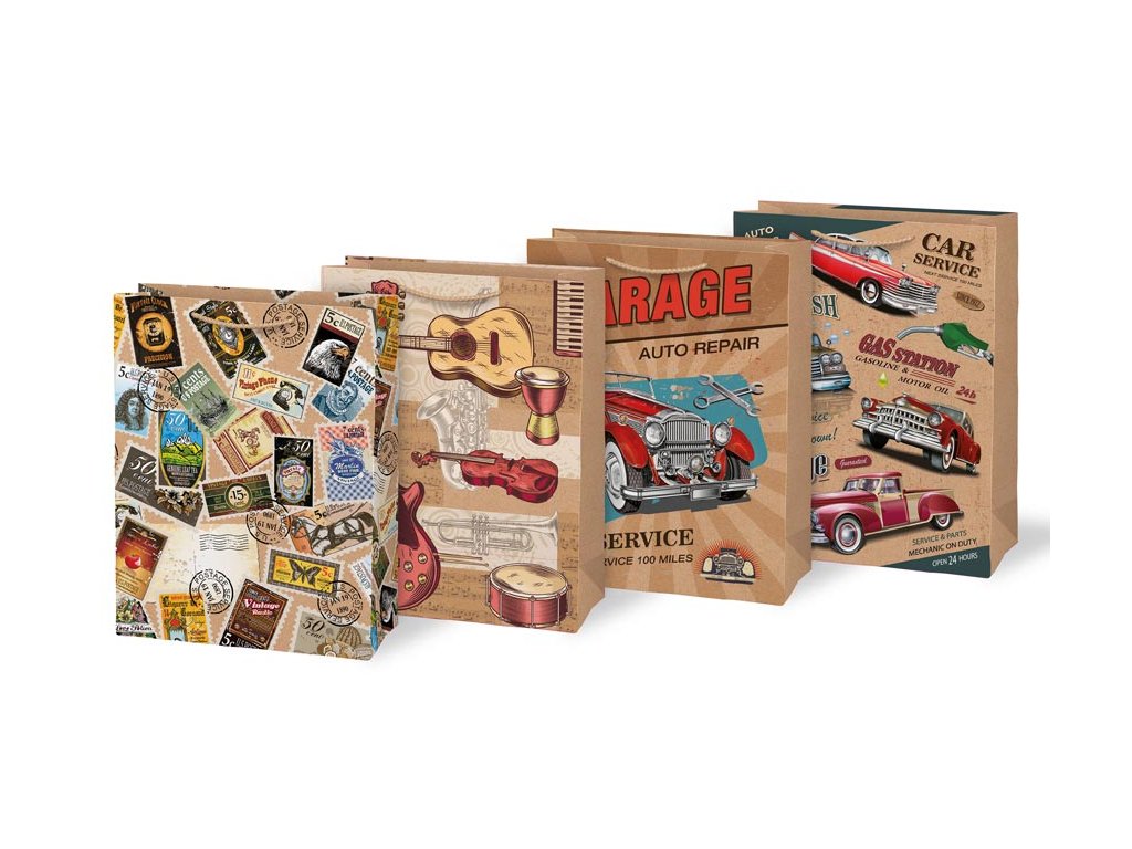 Darčeková taška L KRAFT z pevného kraftového papiera s farebnou potlačou. Taška má pletené textilné uši a kartičku kam môžete napísať meno alebo krátke venovanie. Pokiaľ nemáte čas baliť darček do darčekového baliaceho papiera tak práve pre Vás máme široký výber darčekových tašiek. MOTIV: - známky - auto veterán - auto veteráni - hudobné nástroje Farba: hnedá/prírodná Materiál: kraftový papier Rozmer: 260 x 340 x 140 mm Dodávame v mixe po 4 ks podľa skladovej zásoby. Uvedená cena je za 1 ks.Dodatočné parametre