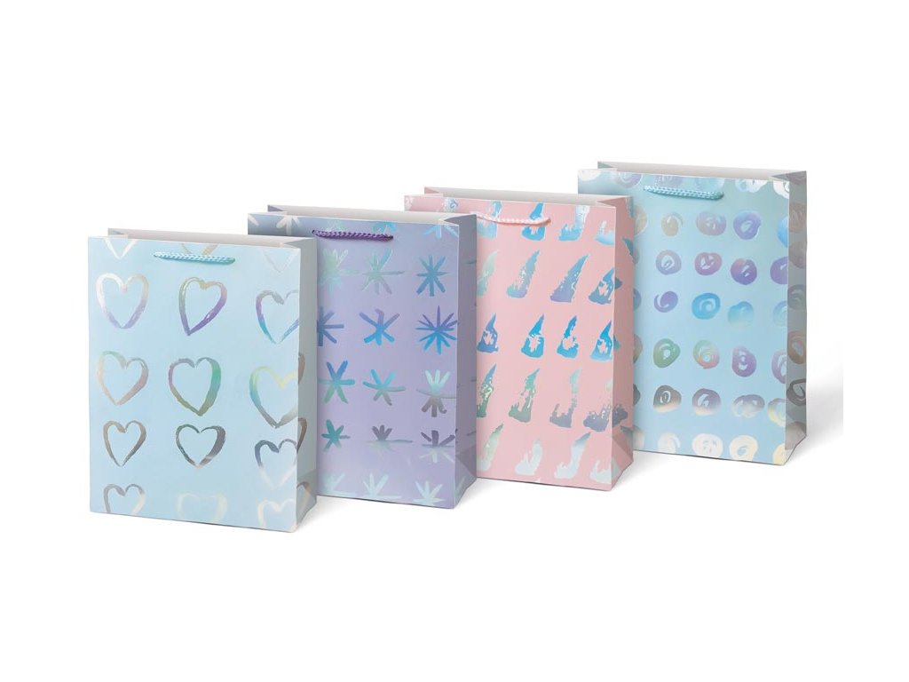 Farebná darčeková papierová taška M LUX v kombinácii motívov a farieb. Taška má pevné držadlo na jednoduché prenášanie a kartu, na ktorú môžete napísať svoje meno alebo krátke venovanie. Darčekové tašky sú skvelé na darčeky, ktoré sa ťažko balia do baliaceho papiera. Sú tiež veľmi praktické pre tých, ktorí neradi balia darčeky alebo to nevedia robiť a neboli by s výsledkom spokojní. Veľkosť: 180 x 230 x 90 mm Farba: 2 x svetlomodrá, fialová, ružová Motív: srdiečka, hviezdičky, trojuholníky, bodky Dodávame v mixe 4 ks podľa skladových zásob. Cena je za 1 ks.Dodatočné parametre