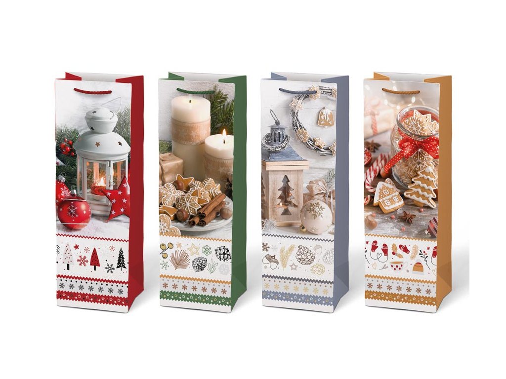 Vianočná, darčeková, papierová taška T12 na víno alebo iné fľaše. Taška má pevnú rukoväť na jednoduché prenášanie. Ak nemáte čas zabaliť darček do darčekového papiera, máme široký výber darčekových tašiek práve pre vás. Motív: zmes vianočných motívov Rozmery: 120 x 360 x 100 mm Dodávame v mixe 4 ks podľa skladových zásob. Uvedená cena je za 1 ks.Dodatočné parametre