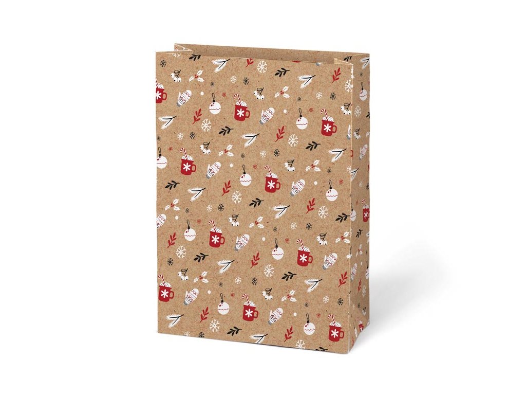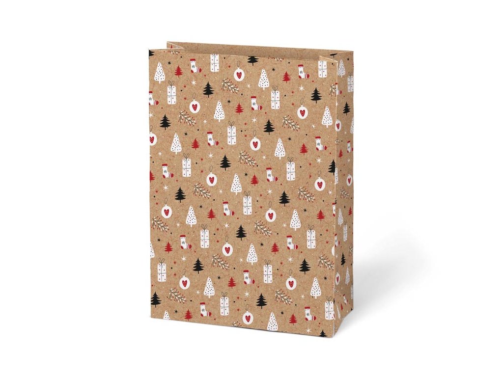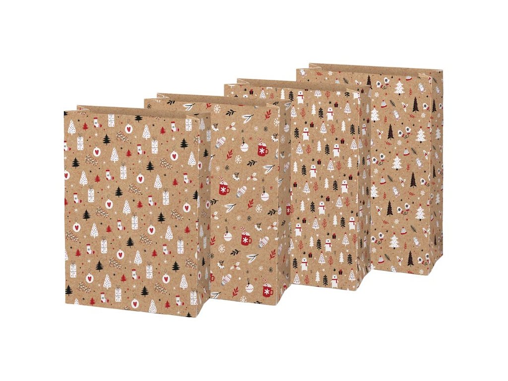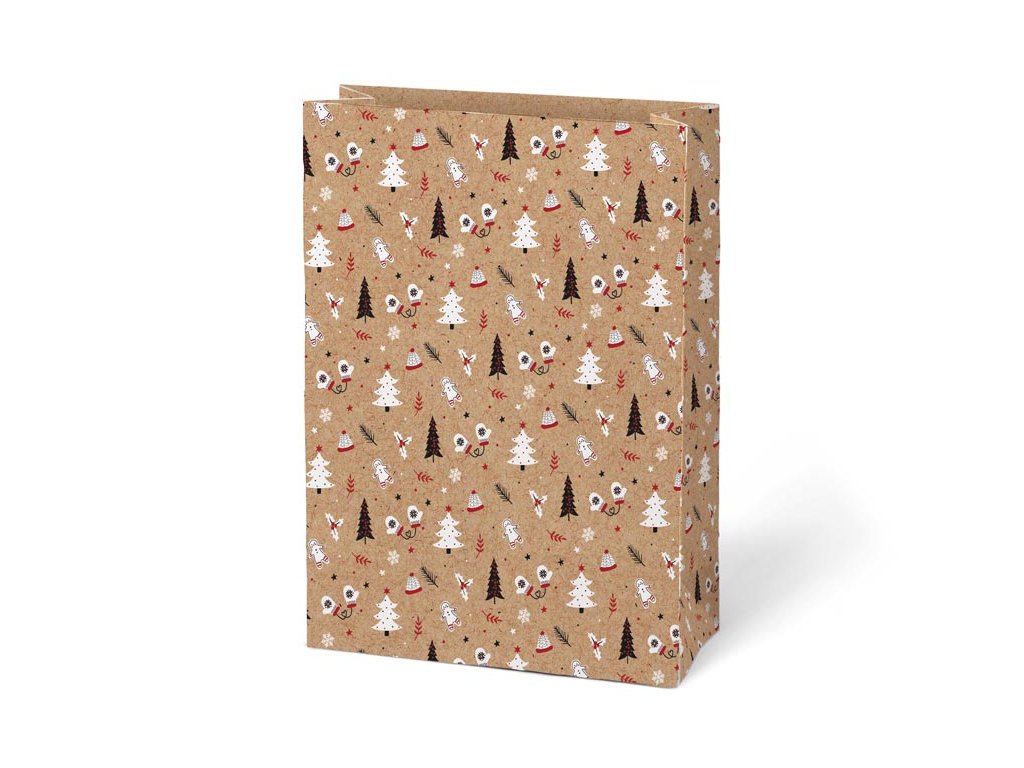 Vianočné darčekové papierové vrecúško KRAFT. Vrecúška sú vyrobené z pevného kraftového papiera. Sú ideálne na balenie vianočných cukroviniek, perníkov alebo sušeného ovocia. Na uzavretie vrecúšok môžete použiť ozdobný špendlík, samolepiacu menovku alebo stuhu a vytvoriť tak jedinečný darček. Balenie: 12 ks Hmotnosť: 120 g Farba: prírodná hnedá Rozmery: 260 x 360 x 120 mm Motív: zmes vianočných motívov Dodávame v mixe 4 ks podľa skladových zásob. Uvedená cena je za 1 ks.Dodatočné parametre