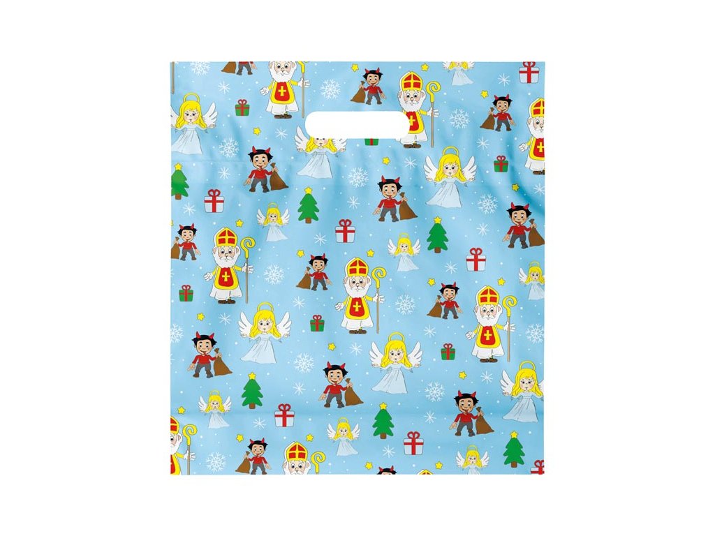 Igelitová taška s priehmatom s mikulášskym motívom. Na taške je obrázok Mikuláša, anjela, čerta, vianočných darčekov a stromčeka. Materiál: PE Rozmery: 290 x 320 x 80 mm Praktické balenie – odtrhávací blok Všetkých 100 ks je balených v sáčku. Uvedená cena je za 1 ks.Dodatočné parametre