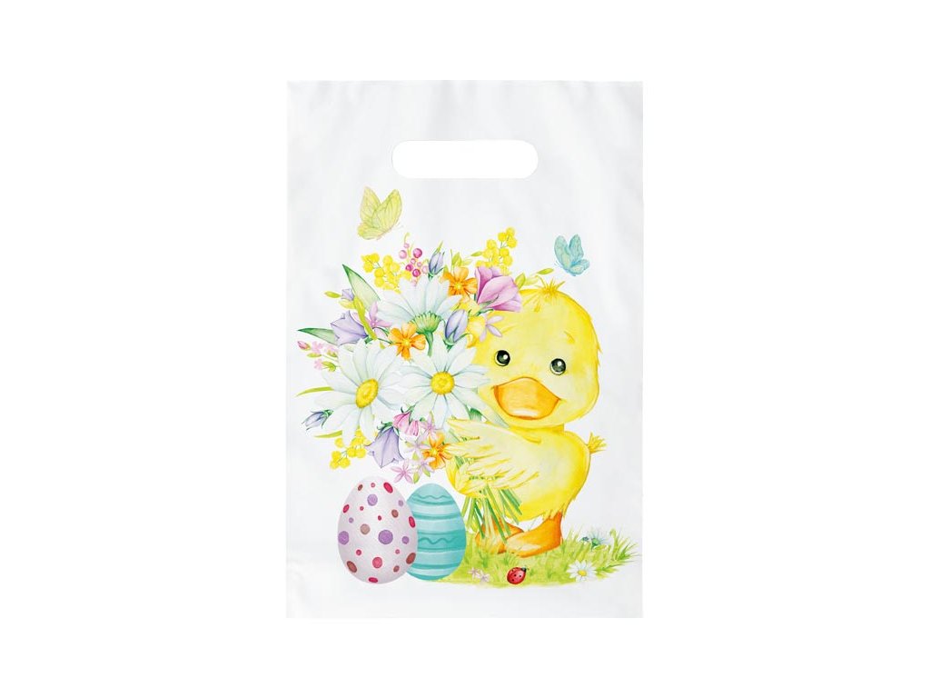 Igelitová taška s priehmatom s veľkonočným motívom kraslíc, káča a kvetov. Ideálne na vytváranie čokoládových balíčkov pre deti! Tlač: 4+0 cmyk Materiál: Polyetylén Rozmer: 200 x 300 x 80 mm Hrúbka materiálu: 0,045 my Uvedená cena je za 1 ks.Dodatočné parametre