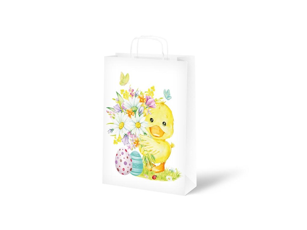 Veľkonočná darčeková papierová taška v bielej farbe s motívom kraslíc, káča a kvetov. Ideálne na vytváranie čokoládových balíčkov pre deti! Materiál: papier Rozmer: 180 x 240 x 80 mm Uvedená cena je za 1 ks.Dodatočné parametre