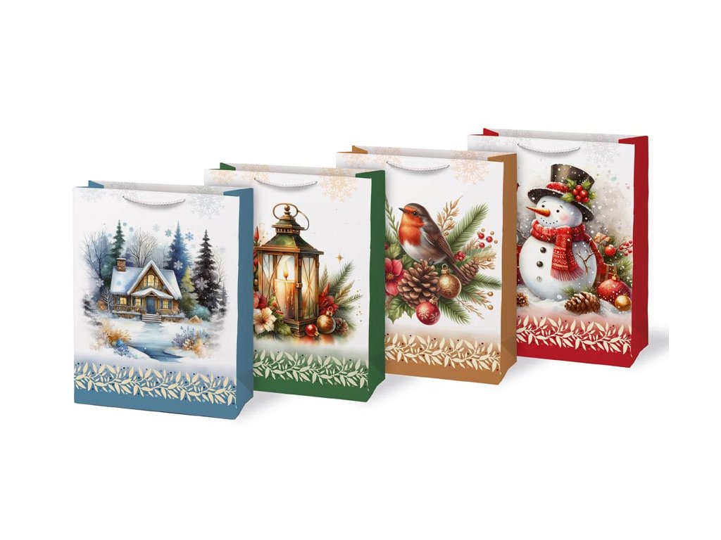 Vianočná darčeková papierová taška T10 s vianočnými motívmi je dokonalým spojením elegancie a praktickosti. Taška je vhodná na balenie všetkých druhov darčekov, od malých prekvapení po väčšie predmety, a pridáva im kúzlo sviatočnej atmosféry. Je skutočne nepostrádateľným pomocníkom, keď sa balenie darčeka do klasického baliaceho papiera zdá byť príliš ťažké. Jej robustné uši zaisťujú pohodlné a bezpečné prenášanie. Rozmer: 330 x 450 x 150 mm Motív: zasnežená chalupa, vianočná lampáš, vtáčik na vetve, snehuliak Dodávame v mixe po 4 ks podľa skladovej zásoby. Uvedená cena je za 1 ks.Dodatočné parametre