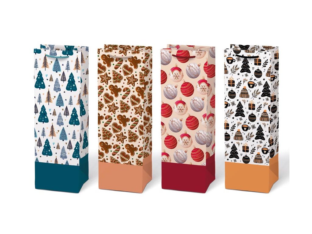 Vianočná darčeková papierová taška T12 s vianočnými motívmi je dokonalým spojením elegancie a praktickosti. Taška je vhodná na balenie všetkých druhov fliaš. Jej robustné uši zaisťujú pohodlné a bezpečné prenášanie. Rozmer: 120 x 360 x 100 mm Motív: vianočné stromčeky, perníčky, vianočné gule, mix vianočné motívov Dodávame v mixe po 4 ks podľa skladovej zásoby. Uvedená cena je za 1 ks.Dodatočné parametre