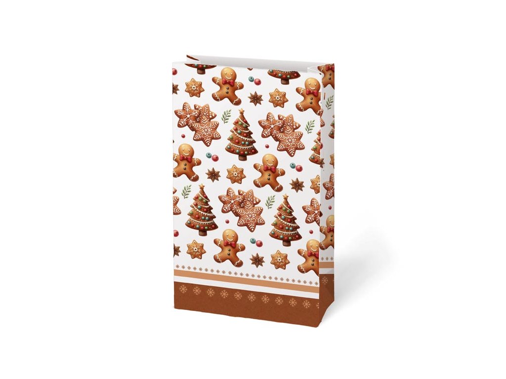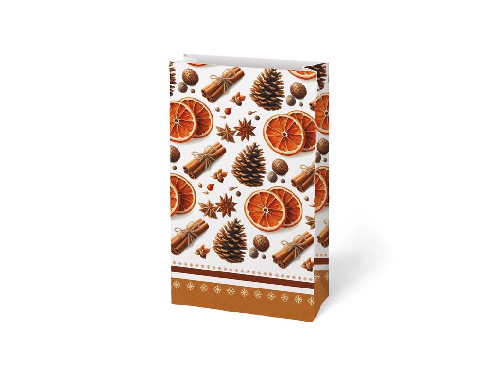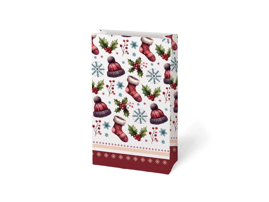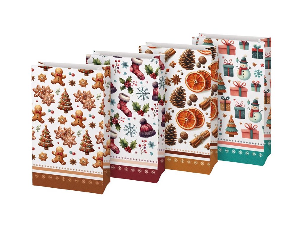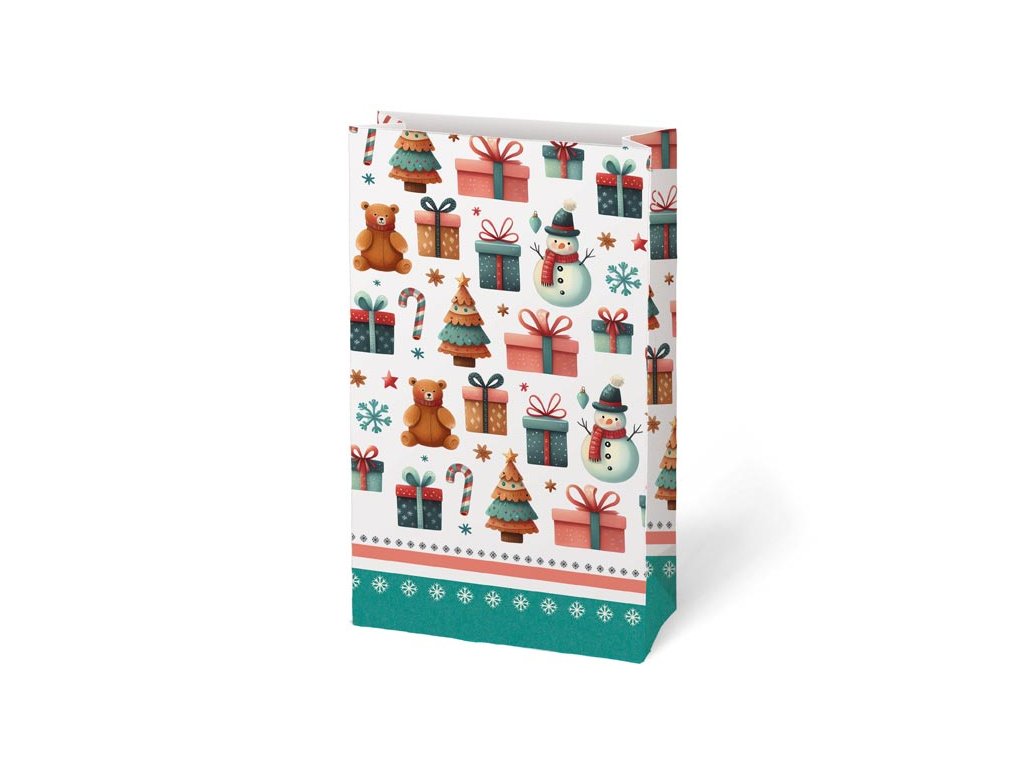 Darčekové papierové vrecko KRAFT 3 s vianočným motívom vyrobené z pevného kraftového papiera. Je ideálny na zabalenie malého darčeka, sladkostí, orieškov alebo sušeného ovocia. Na uzavretie vrecka môžete použiť dekoratívny kolíček, samolepiacu menovku alebo stuhu a vytvoriť tak jedinečný darček. Balenie: 12 ks Gramáž: 120 g Materiál: kraftový papier Rozmer: 100 x 180 x 60 mm Motív: perníčky a vianočné stromčeky, vianočné ponožky a čiapky, sušené ovocie a korenie, vianočné darčeky a medvedíci Dodávame v mixe 4 ks podľa skladovej zásoby. Uvedená cena je za 1 ks.Dodatočné parametre
