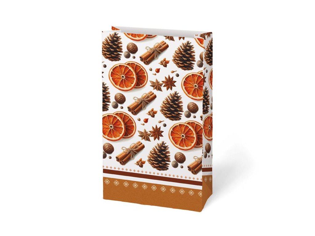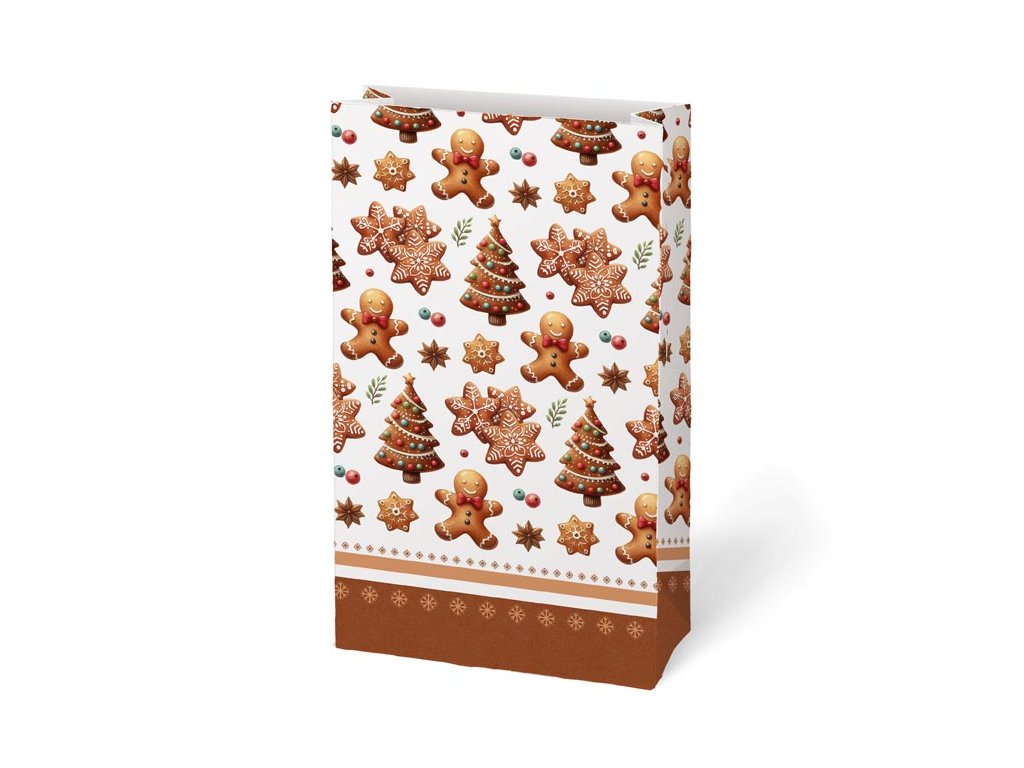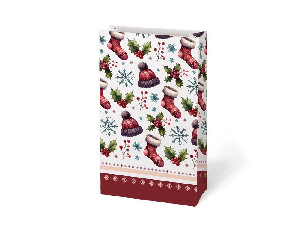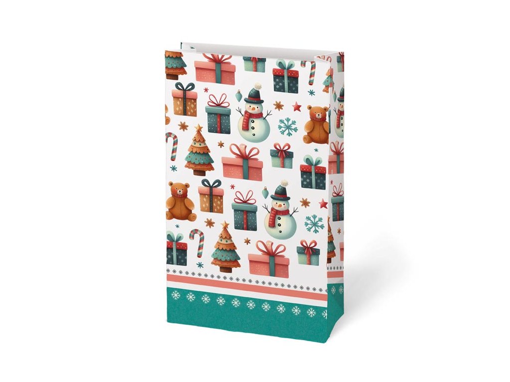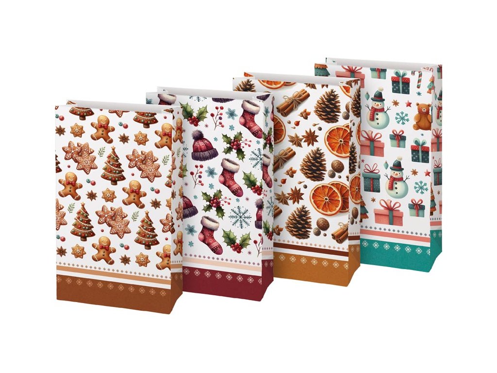 Darčekové papierové vrecko KRAFT 3 s vianočným motívom vyrobené z pevného kraftového papiera. Je ideálny na zabalenie malého darčeka, sladkostí, orieškov alebo sušeného ovocia. Na uzavretie vrecka môžete použiť dekoratívny kolíček, samolepiacu menovku alebo stuhu a vytvoriť tak jedinečný darček. Balenie: 12 ks Gramáž: 120 g Materiál: kraftový papier Rozmer: 150 x 270 x 90 mm Motív: perníčky a vianočné stromčeky, vianočné ponožky a čiapky, sušené ovocie a korenie, vianočné darčeky a medvedíci Dodávame v mixe 4 ks podľa skladovej zásoby. Uvedená cena je za 1 ks.Dodatočné parametre