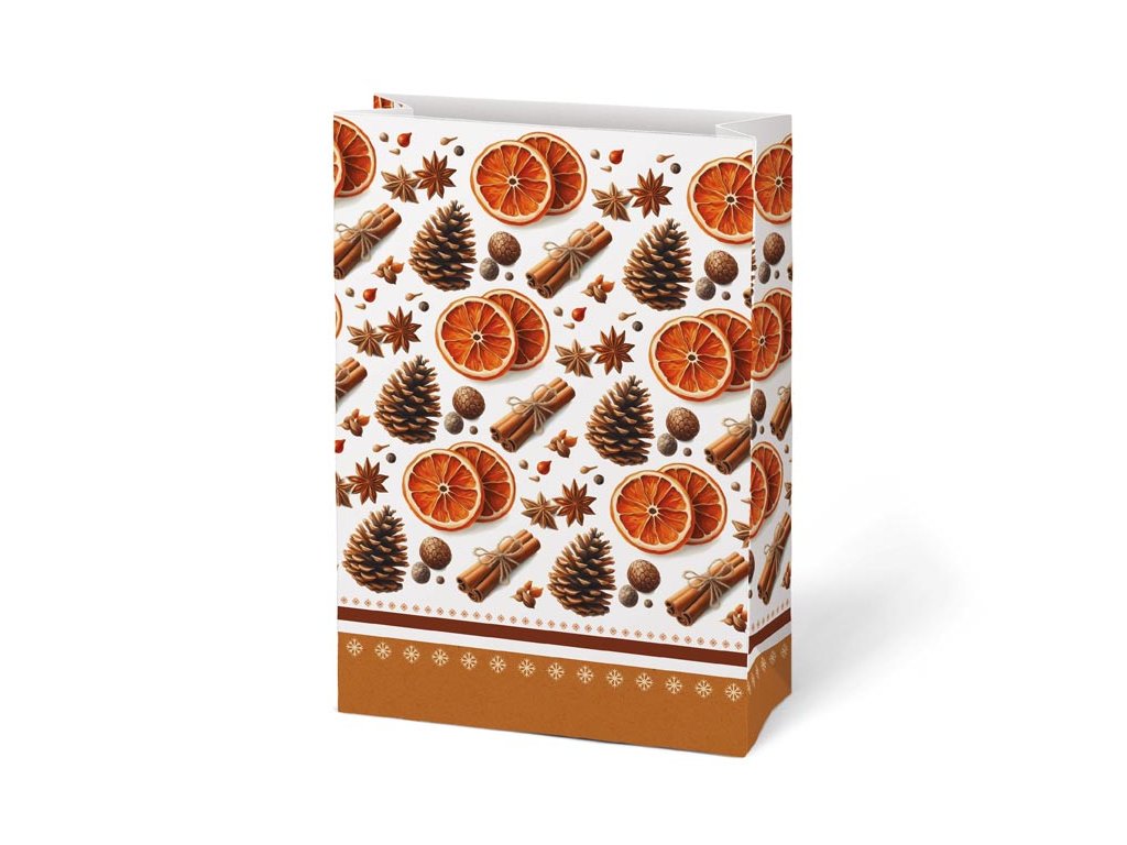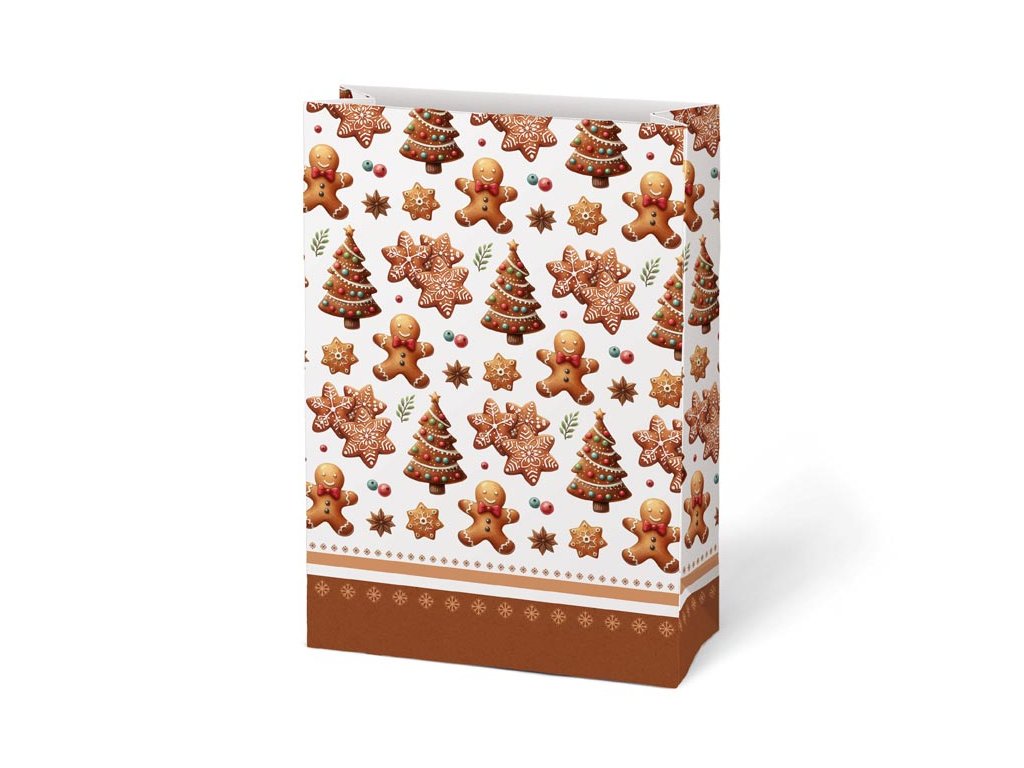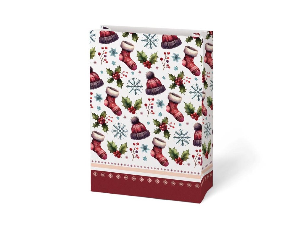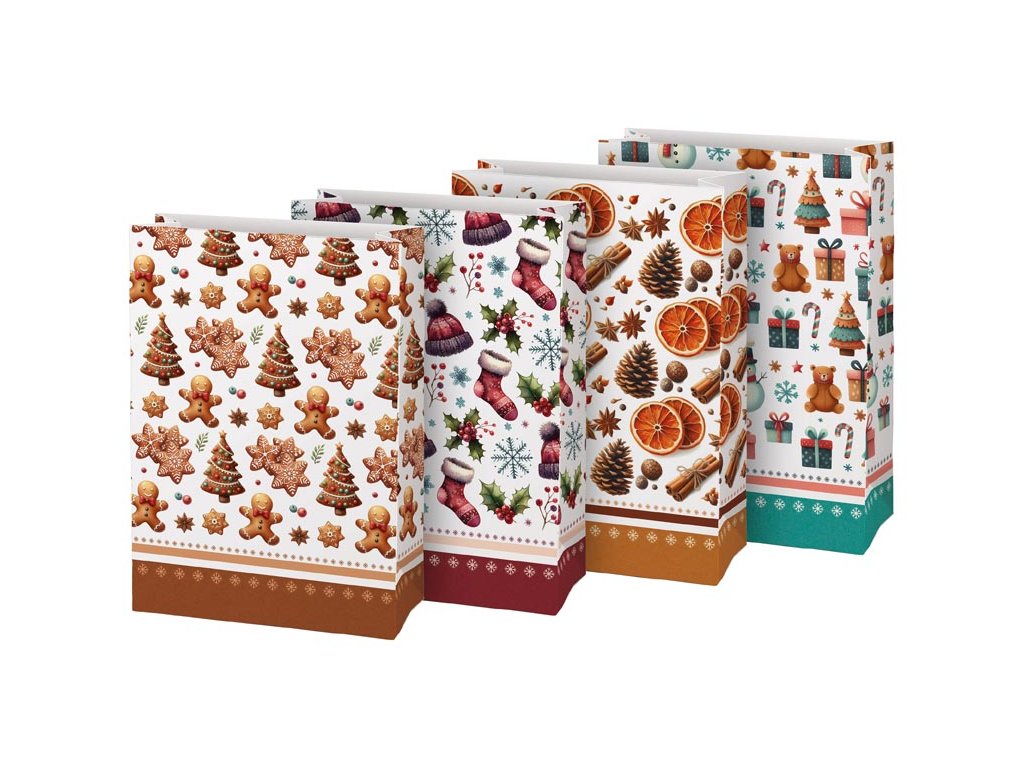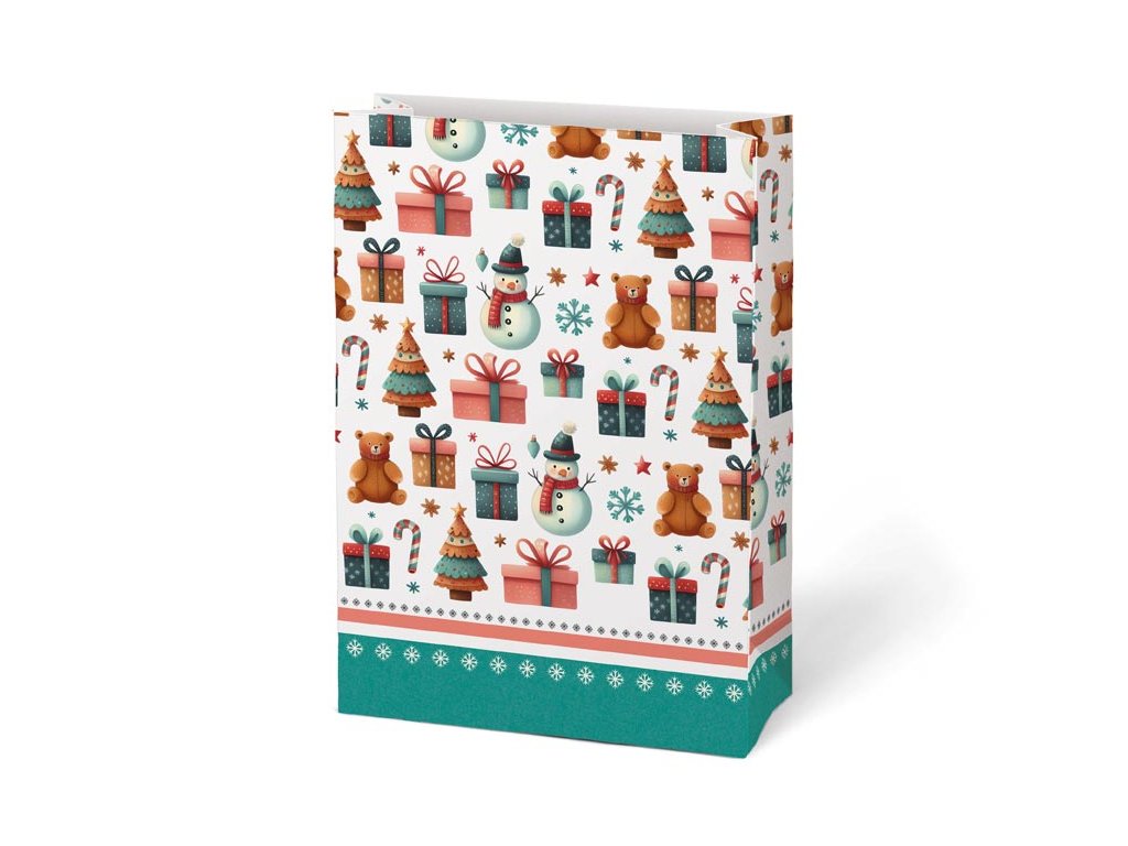 Darčekové papierové vrecko KRAFT 3 s vianočným motívom vyrobené z pevného kraftového papiera. Je ideálny na zabalenie malého darčeka, sladkostí, orieškov alebo sušeného ovocia. Na uzavretie vrecka môžete použiť dekoratívny kolíček, samolepiacu menovku alebo stuhu a vytvoriť tak jedinečný darček. Balenie: 12 ks Gramáž: 120 g Materiál: kraftový papier Rozmer: 260 x 360 x 120 mm Motív: perníčky a vianočné stromčeky, vianočné ponožky a čiapky, sušené ovocie a korenie, vianočné darčeky a medvedíci Dodávame v mixe po 4 ks podľa skladovej zásoby. Uvedená cena je za 1 ks.Dodatočné parametre
