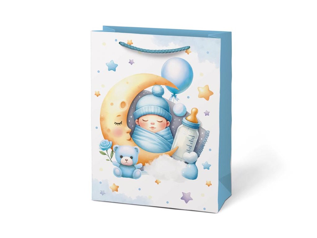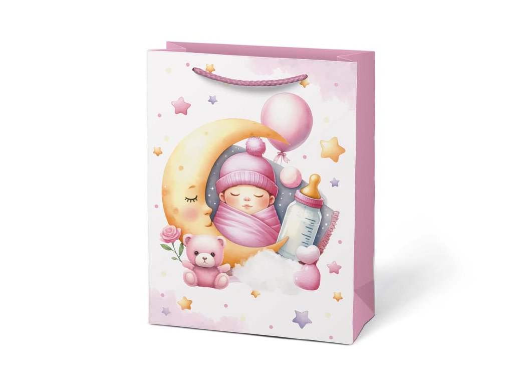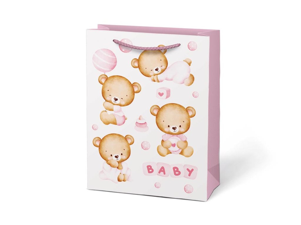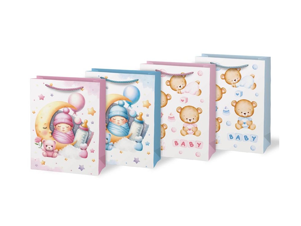 Papierová darčeková taška T4 s detskými motívmi. Na výber sú dva dievčenské a dva chlapčenské motívy. Je ideálna na obdarovanie pri príležitostiach, ako sú detské oslavy, krstiny alebo detské párty. Táto darčeková taška dodá vášmu darčeku špeciálny a láskyplný nádych. Darček novým rodičom odovzdáte v elegantnom a roztomilom balení. Rozmery: 190 x 250 x 100 mm Motív: dievčenské, chlapčenský Dodávame v mixe 4 ks podľa skladových zásob. Uvedená cena je za 1 ks.Dodatočné parametre
