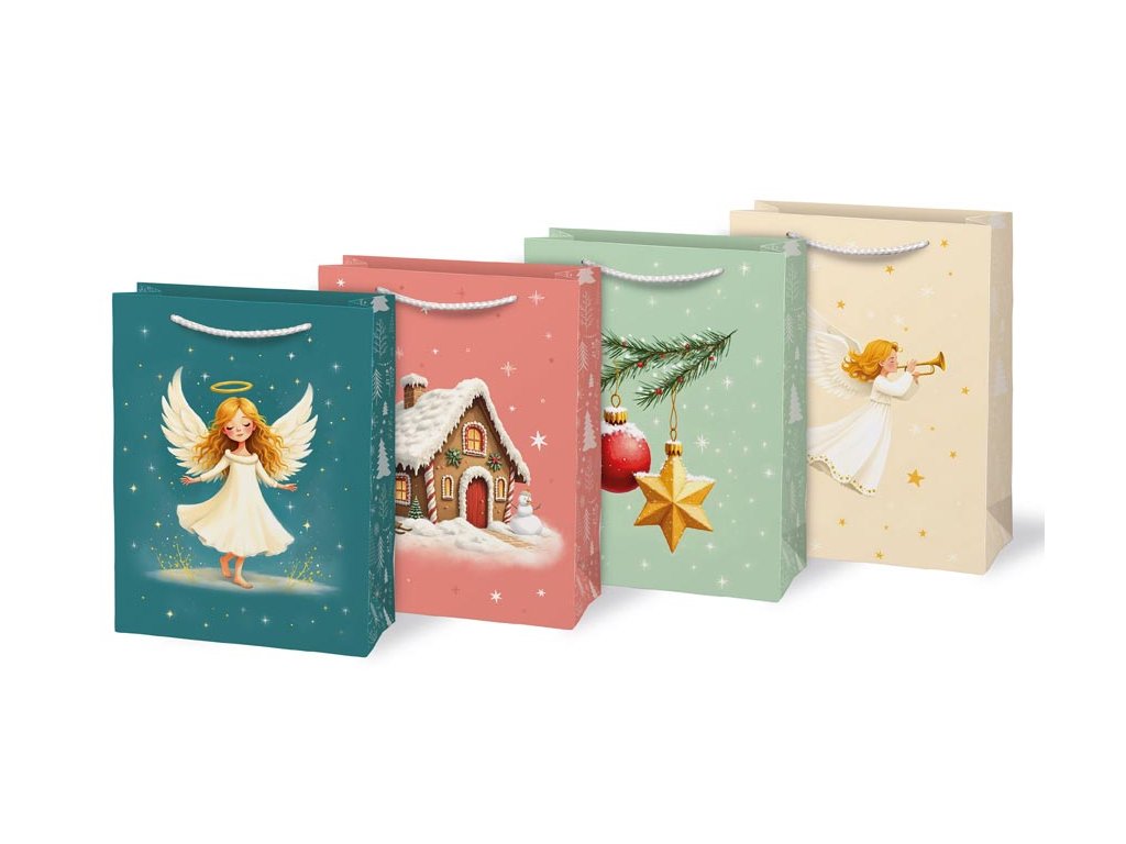 Chcete svojmu darčeku dodať kúzelný a nežný vzhľad? Papierová vianočná taška MFP T4 s rozmerom 190 × 250 × 90 mm zaujme jemnými motívmi anjelov, vianočnej chalúpky a ozdôb. Kombinácia pastelových farieb vytvára príjemnú sviatočnú atmosféru a robí z každého daru ešte väčšiu radosť. Rozmery: 190 × 250 × 90 mm Farba: petrolejová, lososová, svetlozelená, béžová Motív: vianočný – anjeli, zimná chalúpka, ozdoby a sviatočné dekorácie Dodávame v mixe 4 motívov a farieb podľa aktuálnej skladovej dostupnosti. Uvedená cena je za 1 ks.Dodatočné parametre