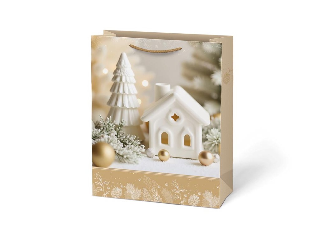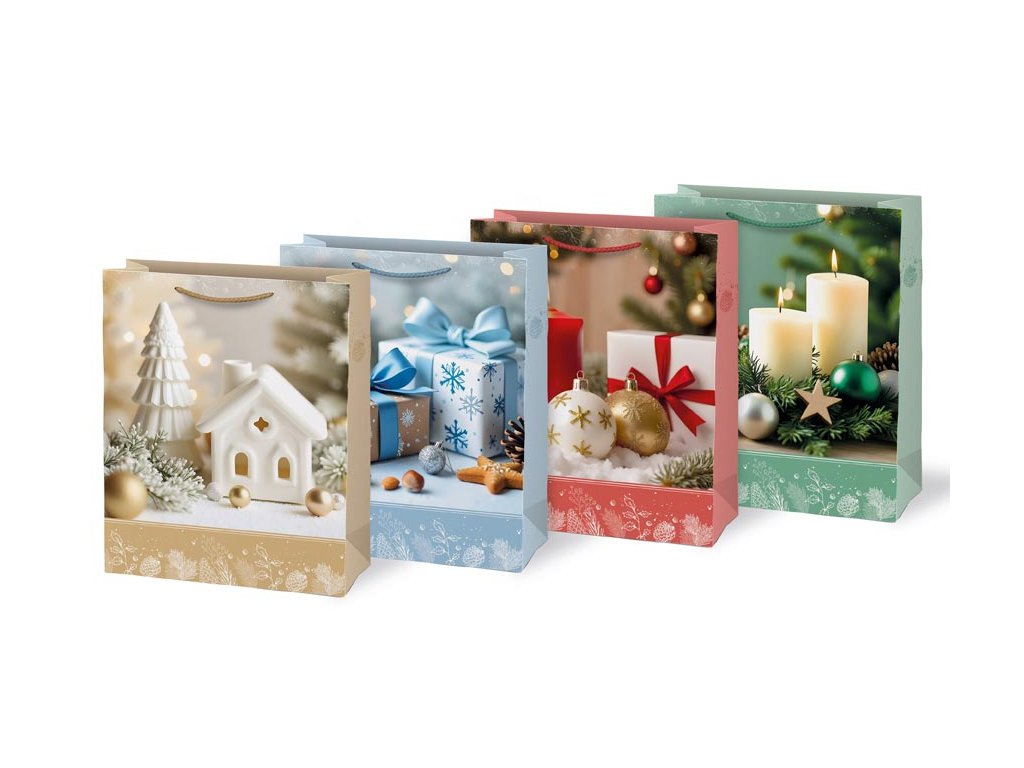 Zabaľte svoj darček rýchlo, štýlovo a bez starostí. Táto vianočná papierová darčeková taška T5 s pevnými ušami a sviatočným motívom premení aj obyčajný darček na nezabudnuteľné prekvapenie. Vďaka väčším rozmerom sa do nej pohodlne zmestí kniha, oblečenie či väčšie drobnosti. Elegantná potlač s vianočnými dekoráciami navodí tú pravú sviatočnú atmosféru – či už obdarúvate rodinu, priateľov alebo kolegov. S touto taškou bude balenie darčekov hračka a výsledok vždy očarí. Motív: vianočný Rozmery: 260 × 320 × 138 mm Farba: béžová, svetlomodrá, červená, zelená Dodávame v mixe 4 motívov a farieb podľa aktuálnej skladovej dostupnosti. Uvedená cena je za 1 ks.Dodatočné parametre