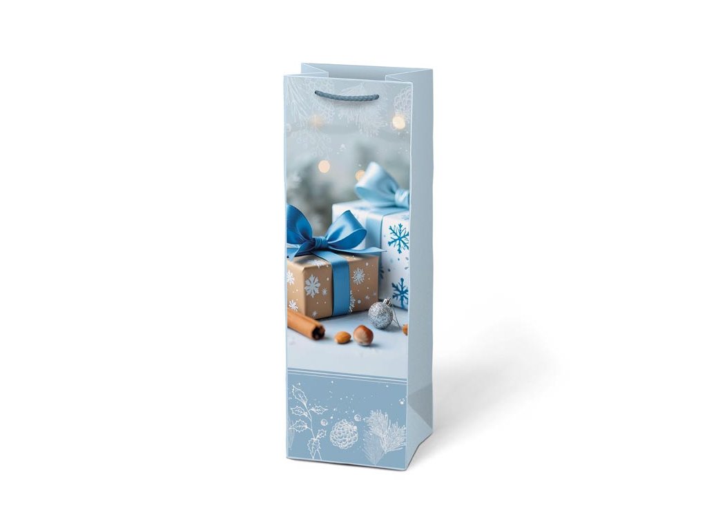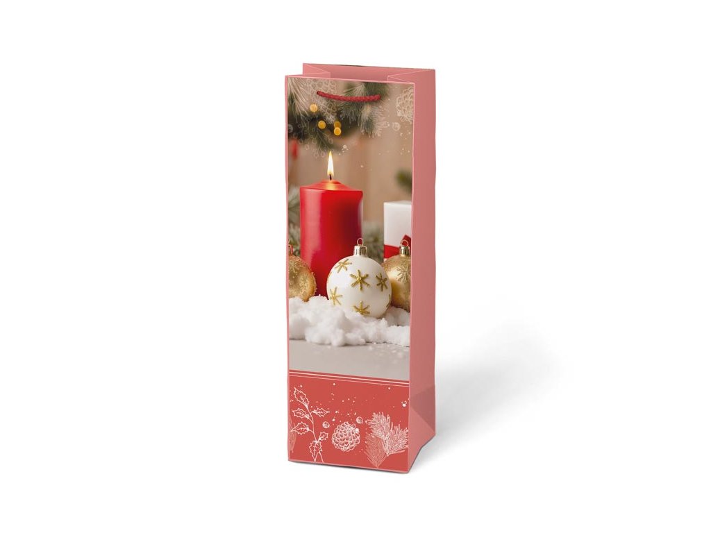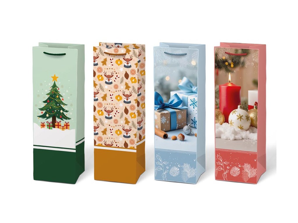 Fľaša vína alebo sektu nemusí končiť v nudnom baliacom papieri. Vianočná darčeková papierová taška MFP T12 urobí z obyčajného nápoja krásny darček behom pár sekúnd. Mix štyroch veselých motívov – vianočný stromček, sobíky, sviečky aj balíčky – vnesie do vašej nádielky radosť a farby. Taška je vyrobená z pevného papiera, má praktické uši a vďaka svojmu tvaru perfektne padne na fľašu. Motív: vianočný Rozmery: 120 × 360 × 100 mm Dodávame v mixe 4 motívov a farieb podľa aktuálnej skladovej dostupnosti. Uvedená cena je za 1 ks.Dodatočné parametre