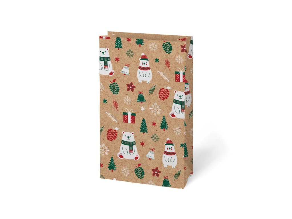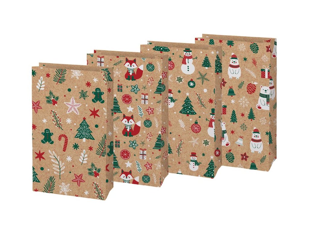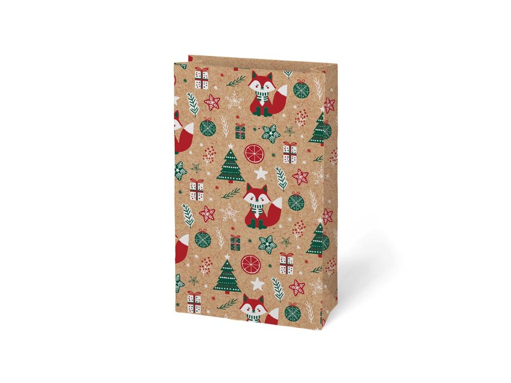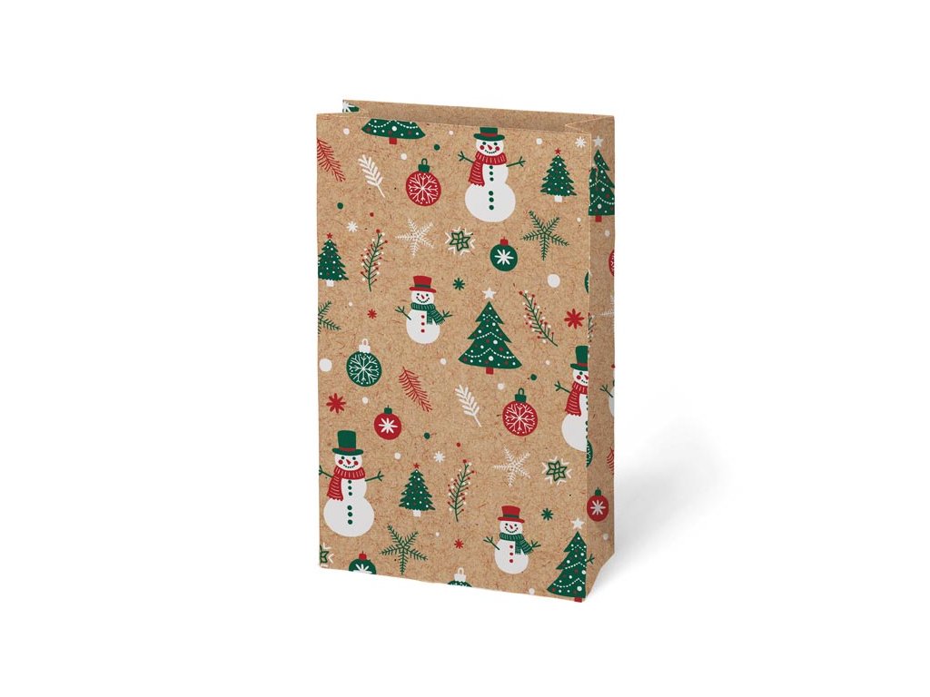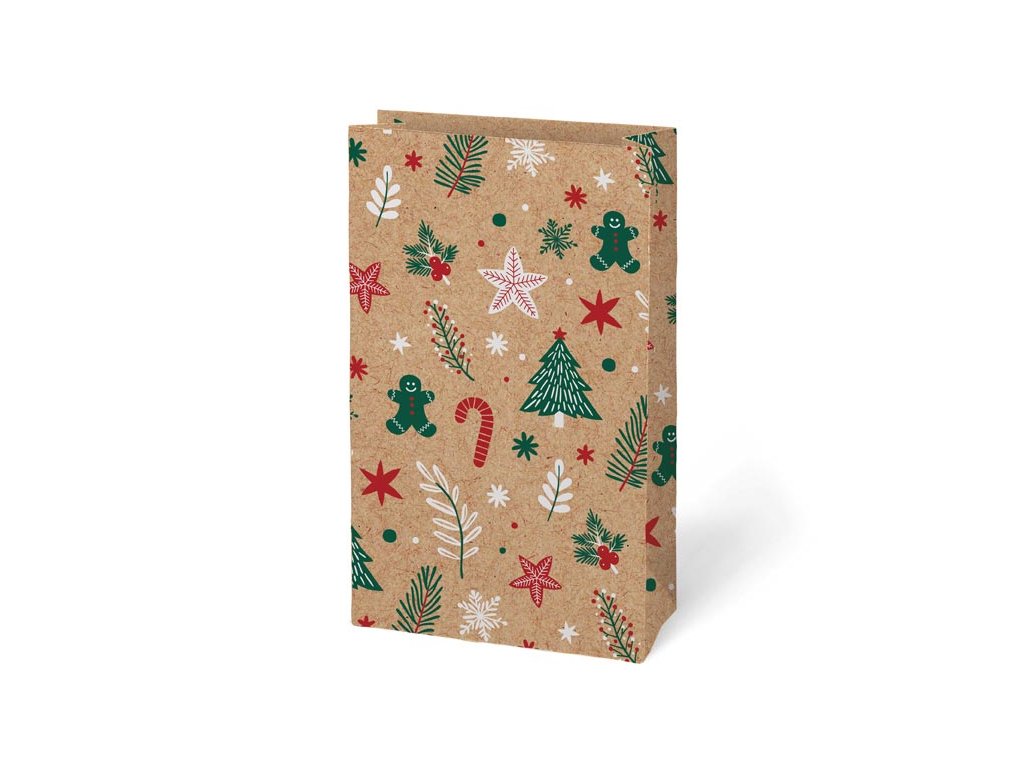 Drobné darčeky si zaslúžia krásne a originálne balenie. Vianočný darčekový papierový sáčok KRAFT 4 je ideálny na sladkosti, maličkosti či malé pozornosti, ktoré chcete odovzdať s eleganciou a sviatočnou náladou. Sáčok je vyrobený z kvalitného kraftového papiera, ktorý je pevný, recyklovateľný a ekologický. Prírodná hnedá farba v kombinácii so štyrmi veselými vianočnými motívmi dodá každému darčeku jedinečný sviatočný vzhľad. Balenie: 12 ks Gramáž: 120 g Motív: vianočný Materiál: kraftový papier Rozmer: 100 × 180 × 60 mm Dodávame v mixe 4 motívov podľa aktuálnej skladovej dostupnosti. Uvedená cena je za 1 ks.Dodatočné parametre