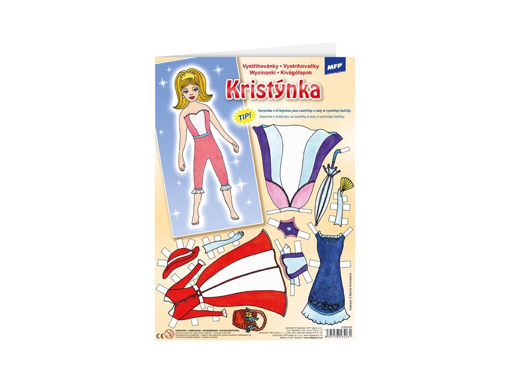 Vystrihovačky s princeznou Kristínkou, vhodné pre mladé slečny. Obleč si princeznú Kristínku podľa svojho vlastného vkusu. Vystrihovačky sú na 2 listoch formátu A4. Nájdeš tu princeznú, množstvo rôznych šiat, vlasov a doplnkov. Vystrihovačky rozvíjajú kreativitu detí pomocou rôznych tvarov, farieb a taktiež zlepšujú motoriku ruky. NÁVOD: 1. Podľa obrysu si vystrihni princeznú a oblečky. 2. Vyber si ten správny obleček a pomocou bielych prúžkov ho zahni okolo siluety princeznej (biele prúžky slúžia k záhybu). 3. Oblečky môžeš jednoducho meniť, kedy sa ti zachce. Papier: 235 g + lamino VAROVANIE: Nevhodné pre deti do 3 rokov. Nebezpečenstvo vdýchnutia a prehltnutia malých častíc. Uvedená cena je za 1 ks.Dodatočné parametre