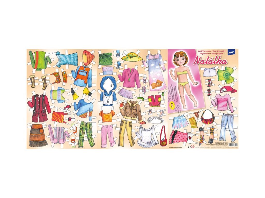Vystrihovačky s dievčatkom Natálkou, vhodné pre mladé slečny. Obleč si Natálku podľa svojho vlastného vkusu. Vystrihovačky sú na 2 listoch formátu A4. Nájdeš tu dievčatko, veľa rôzneho oblečenia a doplnkov. Vystrihovačky rozvíjajú kreativitu detí pomocou rôznych tvarov, farieb a taktiež zlepšujú motoriku ruky. NÁVOD: 1. Podľa obrysu si vystrihni dievčatko a oblečenie. 2. Vyber si ten správny obleček a pomocou bielych prúžkov ho zahni okolo siluety dievčatka (biele prúžky slúžia k záhybu). 3. Oblečky môžeš jednoducho meniť, kedy sa ti zachce. Papier: 235 g + lamino VAROVANIE: Nevhodné pre deti do 3 rokov. Nebezpečenstvo vdýchnutia a prehltnutia malých častíc. Uvedená cena je za 1 ks.Dodatočné parametre