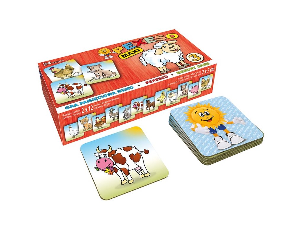 Pexeso pre malé deti s obrázkami zvierat na dvore. Táto kartová hra obsahuje 12 dvojíc obrázkov – hus, mačka, kohút, koza, krava, zajac, kôň, kuriatko, ovca, pes, prasiatko a sliepočka. Pexeso je vyrobené z 3 mm silného materiálu aby ho malé deti mohli lepšie chytiť a otočiť. Hracie kartičky sú veľké 7 x 7 cm. Výborná učebná pomôcka pre deti a rodičov. Naučte svoje deti mená zvieratiek na dvore a precvičujte ich pamäť. Vedeli ste, že slovo PEXESO vzniklo spojením slov PEKELNE SA SÚSTREĎ? https://cs.wikipedia.org/wiki/Pexeso Návod na hru pexeso: Pexeso môžu hrať najmenej dvaja hráči. Všetky rozstrihané kartičky zamiešajú a rozložia obrázkom nadol. Nesmú sa pri tom pozerať na obrázok. Hráči si určia poradie hry. Hráč otočí dve ľubovoľné kartičky tak, aby si aj ostatní spoluhráči mohli obrázky a ich umiestenie zapamätať. Ak kartičky nemajú rovnaké obrázky, otočí ich a vráti na pôvodné miesto. Pokračuje ďalší hráč, ktorý je na rade. Ak objaví rovnaké obrázky, získava bod a obe kartičky vyradí z hry. Pokračuje do tej chvíle, kedy otočí dva rôzne obrázky. Vyhráva hráč, ktorý získa viac bodov. Vhodné pre deti od 3 rokov. Nebezpečenstvo vdýchnutia a prehĺtnutia malých častí.Dodatočné parametre