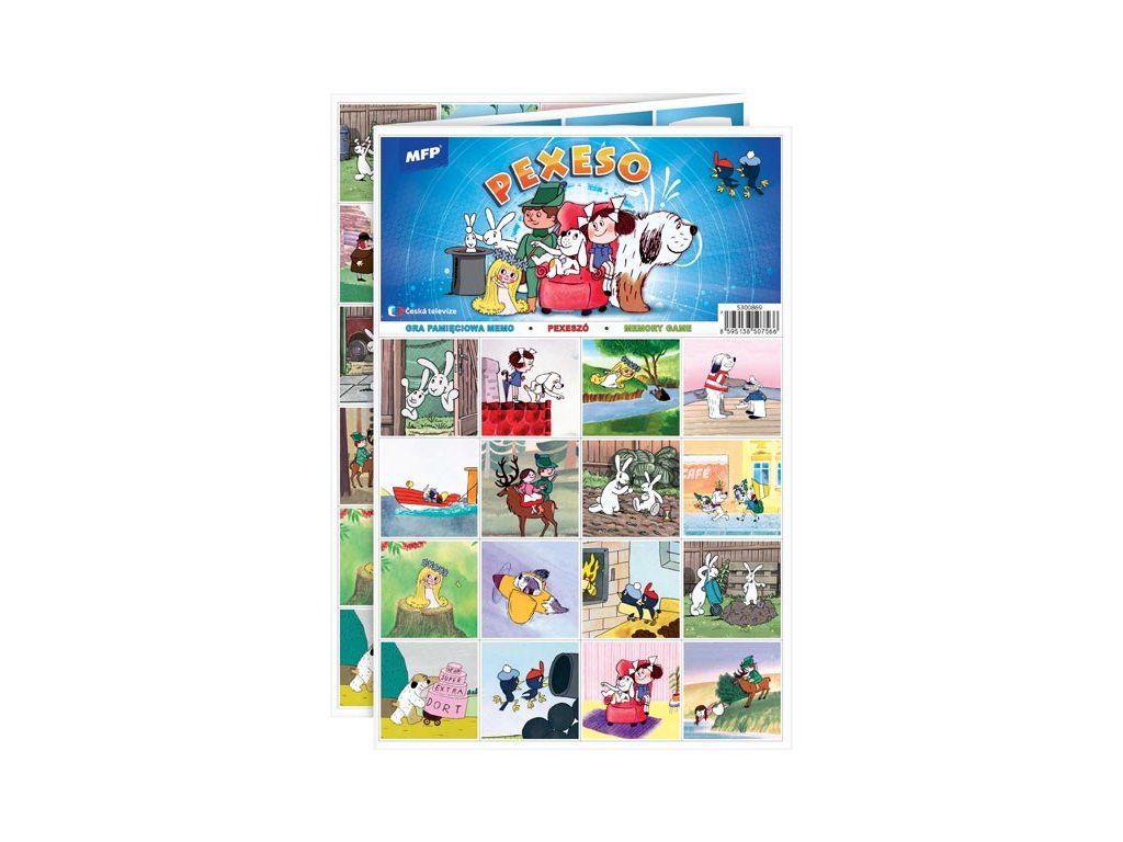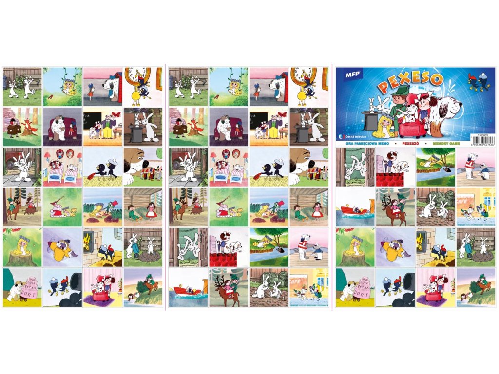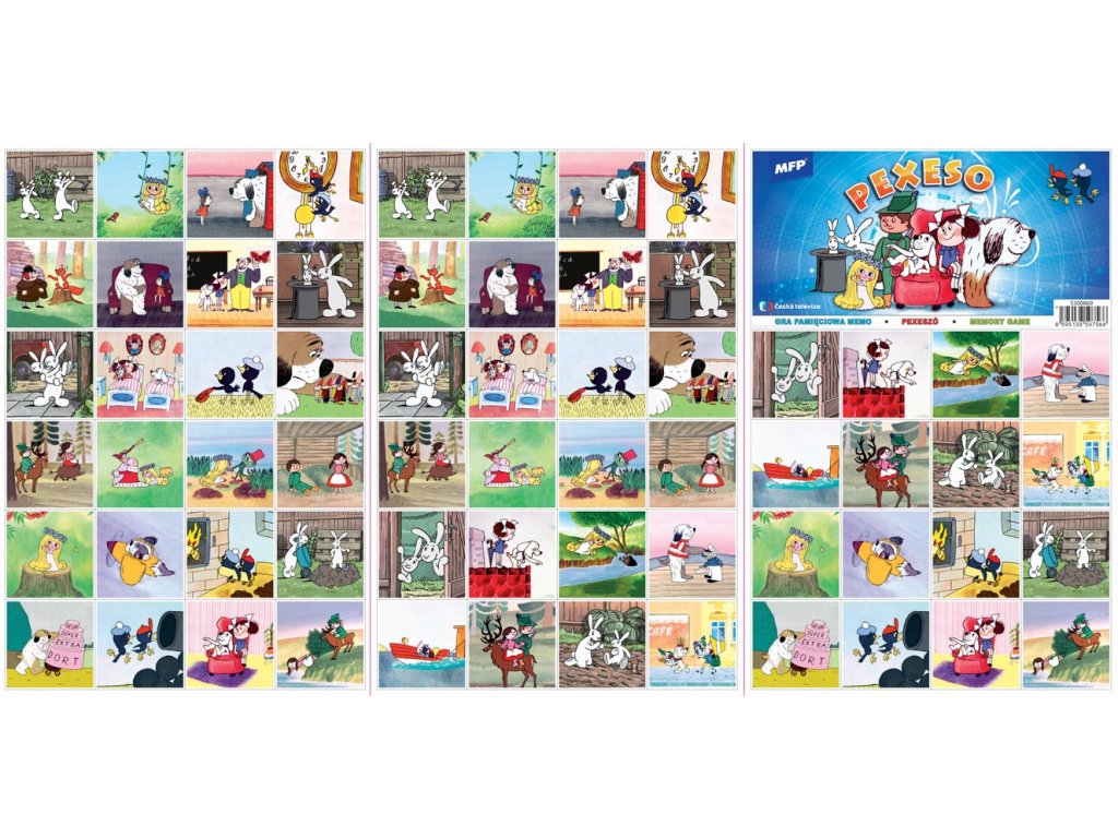 Populárna detská stolná hra. Pexeso pre deti s postavičkami z obľúbených večerníčkov. Táto kartičková hra obsahuje 32 dvojíc obrázkov. Hracie kartičky sú veľkosti 51x51mm. Je to vynikajúca učebná pomôcka pre deti aj pre rodičov. Naučte svoje deti nové slová a previčujte ich pamäť. Vedeli ste, že slovo PEXESO vzniklo zo slovného spojenia PEKelně SE SOustřeď? Návod hry pexeso: Pexeso môžu hrať najmenej dvaja hráči. Všetky postrihané kartičky premiešajú a rozložia ich obrázkom dole na stôl do štvorca 8x8 kartičiek. Nesmú sa pritom pozerať na obrázky. Hráči si určia poradie v hre. Prvý hráč obráti dve ľubovoľné kartičky tak, aby všetci hráči mohli vidieť obrázok a mohli si zapamätať jeho polohu. Ak na kartičkách nie je rovnaký obrázok, obráti ich a vráti na pôvodné miesto. Pokračuje ďalší hráč, ktorý je na rade. Ak nájde dva rovnaké obrázky, získava bod a kartičky vyradí z hry. Pokračuje do tej chvíle, kým neobráti dva rôzne obrázky. Vyhráva hráč, ktorý získa najviac bodov. Rozmery kartičiek: 51x51 mm Rozmery pexesa: 3 x A4 Papier kriedový matný 350 g + lamino lesk 1/1 Nevhodné pre deti do 3 rokov. Nebezpečenstvo vdýchnutia a prehltnutia drobných čiatočiek.Dodatočné parametre