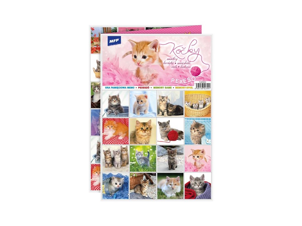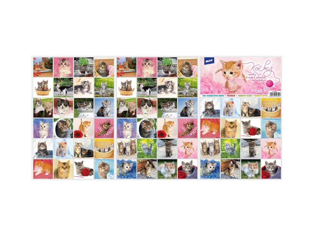 Populárna detská stolová hra pexeso pre malé deti s obrázkami mačiek. Hra obsahuje 32 dvojíc obrázkov veľkosti 51x51 mm. Vynikajúca učebná pomôcka pre deti aj pre rodičov. Naučte svoje deti základné anglické slovíčka a precvičujte ich pamäť. Vedeli ste, že slovo „pexeso“ vzniklo zo slov PEKELNĚ SE SOUSTŘEĎ? Návod na hru pexeso: Pexeso môžu hrať najmenej dvaja hráči. Všetky rozstrihané kartičky zamiešajú a rozložia obrázkom nadol do štvorca 8 x 8 kartičiek. Nesmú sa pri tom pozerať na obrázok. Hráči si určia poradie hry. Hráč otočí dve ľubovoľné kartičky tak, aby si aj ostatní spoluhráči mohli obrázky a ich umiestenie zapamätať. Ak kartičky nemajú rovnaké obrázky, otočí ich a vráti na pôvodné miesto. Pokračuje ďalší hráč, ktorý je na rade. Ak objaví rovnaké obrázky, získava bod a obe kartičky vyradí z hry. Pokračuje do tej chvíle, kedy otočí dva rôzne obrázky. Vyhráva hráč, ktorý získa viac bodov. Rozmer kartičky: 51x51 mm Rozměr pexesa: 3 x A4 Papier krieda matná 350g + lamino lesk 1/1. Vhodné pre deti od 3 rokov. Nebezpečenstvo vdýchnutia a prehĺtnutia malých častí.Dodatočné parametre