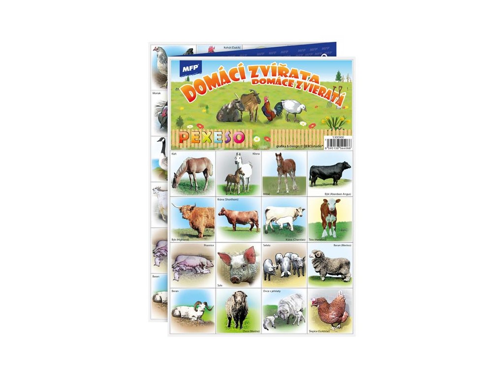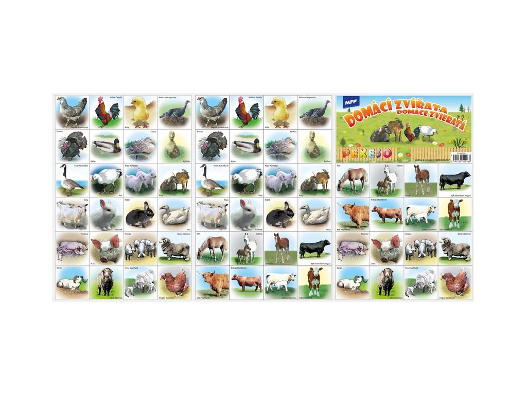 Populárna detská stolová hra pexeso pre malé deti s nazvom domáce zvieratá. Hra obsahuje 32 dvojíc obrázkov veľkosti 51x51 mm. Vynikajúca učebná pomôcka pre deti aj pre rodičov. Naučte svoje deti základné anglické slovíčka a precvičujte ich pamäť. Vedeli ste, že slovo „pexeso“ vzniklo zo slov PEKELNĚ SE SOUSTŘEĎ? Návod na hru pexeso: Pexeso môžu hrať najmenej dvaja hráči. Všetky rozstrihané kartičky zamiešajú a rozložia obrázkom nadol do štvorca 8 x 8 kartičiek. Nesmú sa pri tom pozerať na obrázok. Hráči si určia poradie hry. Hráč otočí dve ľubovoľné kartičky tak, aby si aj ostatní spoluhráči mohli obrázky a ich umiestenie zapamätať. Ak kartičky nemajú rovnaké obrázky, otočí ich a vráti na pôvodné miesto. Pokračuje ďalší hráč, ktorý je na rade. Ak objaví rovnaké obrázky, získava bod a obe kartičky vyradí z hry. Pokračuje do tej chvíle, kedy otočí dva rôzne obrázky. Vyhráva hráč, ktorý získa viac bodov. Rozmer kartičky: 51x51 mm Rozměr pexesa: 3 x A4 Papier krieda matná 350g + lamino lesk 1/1. Vhodné pre deti od 3 rokov. Nebezpečenstvo vdýchnutia a prehĺtnutia malých častí.Dodatočné parametre