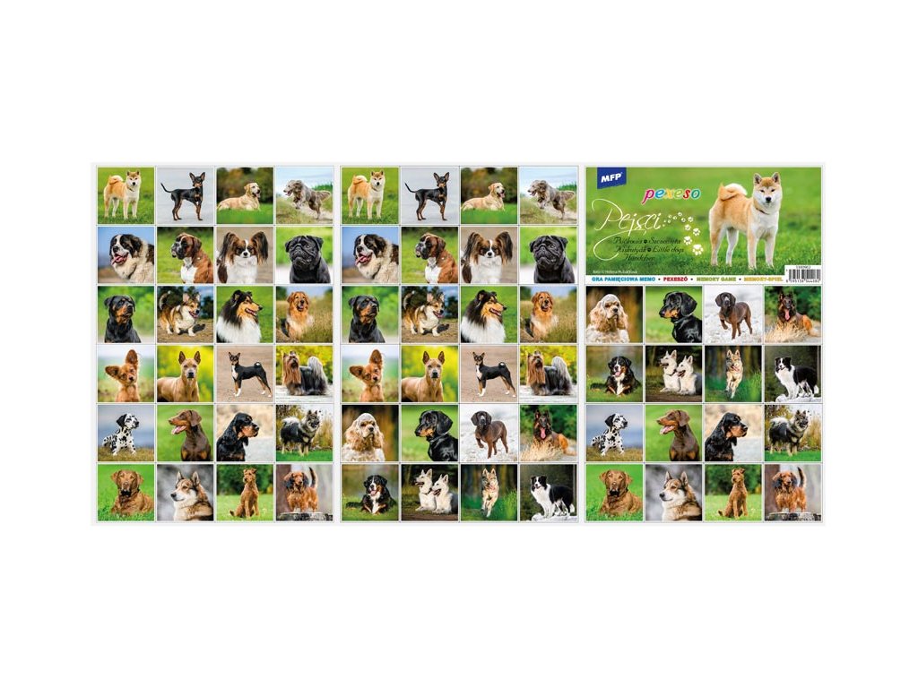 Populárna, detská, stolová hra pexeso pre malé deti s nazvom psíkovia. Hra obsahuje 32 dvojíc obrázkov veľkosti 51x51 mm. Vynikajúca učebná pomôcka pre deti aj pre rodičov. Naučte svoje deti základné anglické slovíčka a precvičujte ich pamäť. Vedeli ste, že slovo „pexeso“ vzniklo zo slov PEKELNĚ SE SOUSTŘEĎ? Návod na hru pexeso: Pexeso môžu hrať najmenej dvaja hráči. Všetky rozstrihané kartičky zamiešajú a rozložia obrázkom nadol do štvorca 8 x 8 kartičiek. Nesmú sa pri tom pozerať na obrázok. Hráči si určia poradie hry. Hráč otočí dve ľubovoľné kartičky tak, aby si aj ostatní spoluhráči mohli obrázky a ich umiestenie zapamätať. Ak kartičky nemajú rovnaké obrázky, otočí ich a vráti na pôvodné miesto. Pokračuje ďalší hráč, ktorý je na rade. Ak objaví rovnaké obrázky, získava bod a obe kartičky vyradí z hry. Pokračuje do tej chvíle, kedy otočí dva rôzne obrázky. Vyhráva hráč, ktorý získa viac bodov. Rozmer kartičky: 51x51 mm Rozměr pexesa: 3 x A4 Papier krieda matná 350g + lamino lesk 1/1. Vhodné pre deti od 3 rokov. Nebezpečenstvo vdýchnutia a prehĺtnutia malých častí. Uvedená cena je za 1 ks.Dodatočné parametre