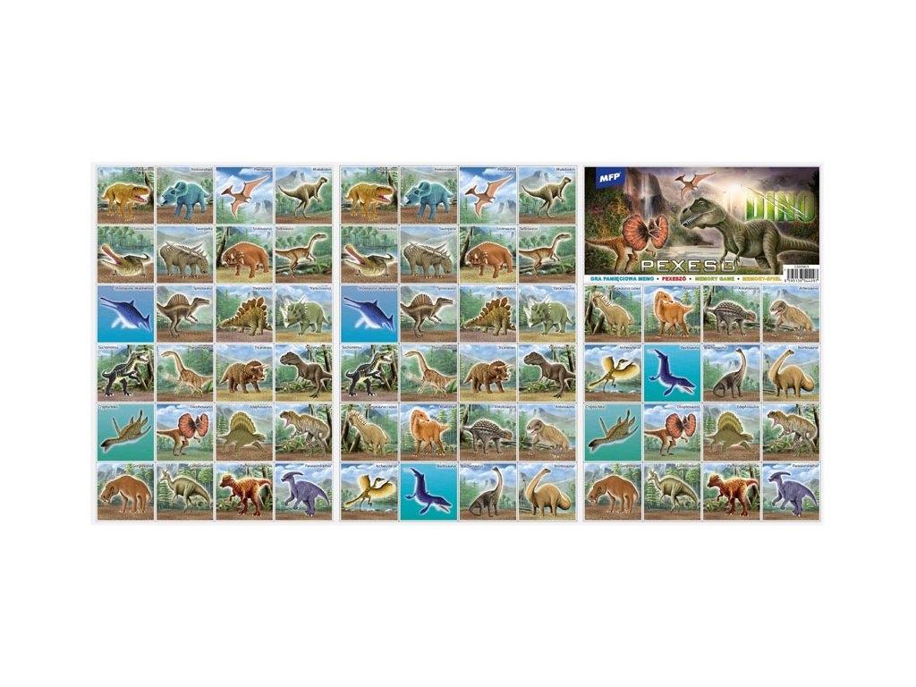 Populárna detská stolová hra pexeso pre malé deti s nazvom Dino. Hra obsahuje 32 dvojíc obrázkov veľkosti 51x51 mm. Vynikajúca učebná pomôcka pre deti aj pre rodičov. Naučte svoje deti základné anglické slovíčka a precvičujte ich pamäť. Vedeli ste, že slovo „pexeso“ vzniklo zo slov PEKELNĚ SE SOUSTŘEĎ? Návod na hru pexeso: Pexeso môžu hrať najmenej dvaja hráči. Všetky rozstrihané kartičky zamiešajú a rozložia obrázkom nadol do štvorca 8 x 8 kartičiek. Nesmú sa pri tom pozerať na obrázok. Hráči si určia poradie hry. Hráč otočí dve ľubovoľné kartičky tak, aby si aj ostatní spoluhráči mohli obrázky a ich umiestenie zapamätať. Ak kartičky nemajú rovnaké obrázky, otočí ich a vráti na pôvodné miesto. Pokračuje ďalší hráč, ktorý je na rade. Ak objaví rovnaké obrázky, získava bod a obe kartičky vyradí z hry. Pokračuje do tej chvíle, kedy otočí dva rôzne obrázky. Vyhráva hráč, ktorý získa viac bodov. Rozmer kartičky: 51x51 mm Rozměr pexesa: 3 x A4 Papier krieda matná 350g + lamino lesk 1/1. Vhodné pre deti od 3 rokov. Nebezpečenstvo vdýchnutia a prehĺtnutia malých častí.Dodatočné parametre