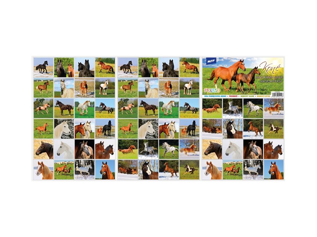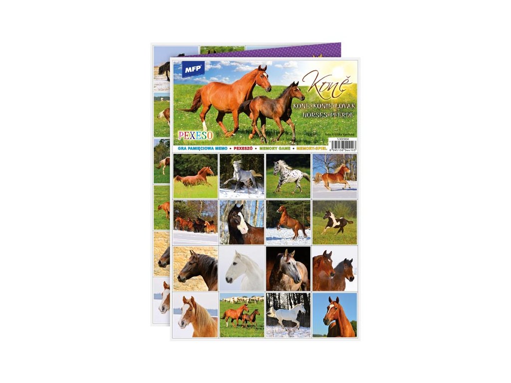 Populárna detská stolová hra pexeso pre malé deti s obrázkami koní. Hra obsahuje 32 dvojíc obrázkov veľkosti 51x51 mm. Vynikajúca učebná pomôcka pre deti aj pre rodičov. Naučte svoje deti základné anglické slovíčka a precvičujte ich pamäť. Vedeli ste, že slovo „pexeso“ vzniklo zo slov PEKELNĚ SE SOUSTŘEĎ? Návod na hru pexeso: Pexeso môžu hrať najmenej dvaja hráči. Všetky rozstrihané kartičky zamiešajú a rozložia obrázkom nadol do štvorca 8 x 8 kartičiek. Nesmú sa pri tom pozerať na obrázok. Hráči si určia poradie hry. Hráč otočí dve ľubovoľné kartičky tak, aby si aj ostatní spoluhráči mohli obrázky a ich umiestenie zapamätať. Ak kartičky nemajú rovnaké obrázky, otočí ich a vráti na pôvodné miesto. Pokračuje ďalší hráč, ktorý je na rade. Ak objaví rovnaké obrázky, získava bod a obe kartičky vyradí z hry. Pokračuje do tej chvíle, kedy otočí dva rôzne obrázky. Vyhráva hráč, ktorý získa viac bodov. Rozmer kartičky: 51x51 mm Rozměr pexesa: 3 x A4 Papier krieda matná 350g + lamino lesk 1/1. Vhodné pre deti od 3 rokov. Nebezpečenstvo vdýchnutia a prehĺtnutia malých častí.Dodatočné parametre