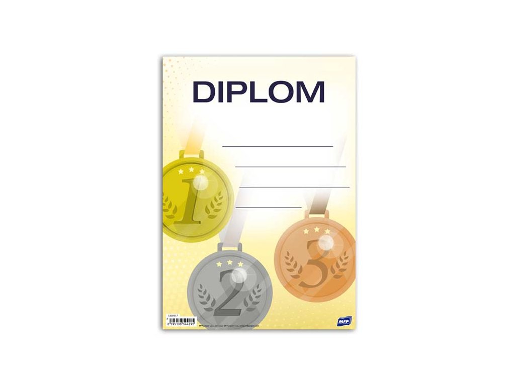 Farebný detský diplom. Určený za športové aktivity. Diplom obsahuje 4 riadky, kam môžete napísať meno, umiestnenie, za čo diplom dostal, prípadne kto ho udeľuje. Formát: A5 Gramáž:300g Druh papiera: kriedový, matnýDodatočné parametre