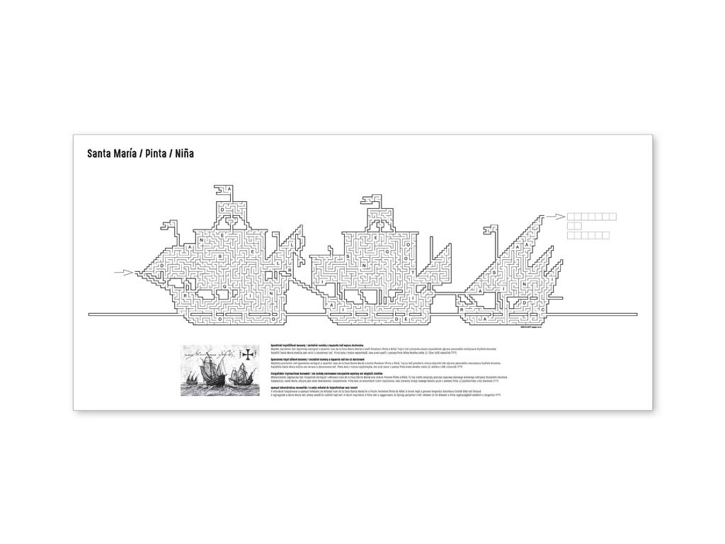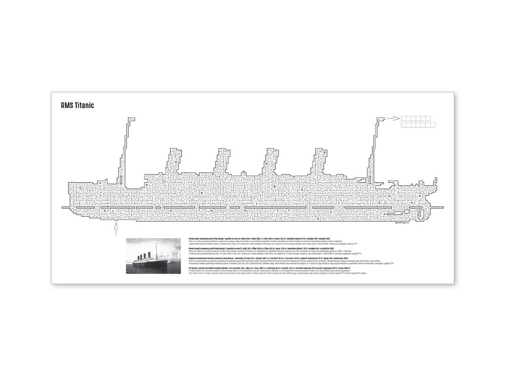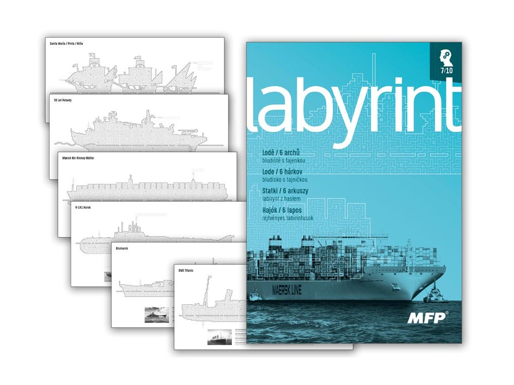 Omaľovánky MFP - Labyrint lode s tajničkou. Prijmi skutočnú výzvu a otestuj svoju trpezlivosť! Správne znenie tajničky nájdeš na jedinej možnej ceste naprieč bludiskom. Vo vnútri bludiska nájdete: 6 hárkov – Lode (RMS Titanic, Bismarck, K-141 Kursk, Maersk Mc-Kinney Moller, 50 rokov Pobedy, Santa Maria, Pinta, Niňa) Formát: A4 Obťažnosť: 7/10 Uvedená cena je za 1 ks.Dodatočné parametre