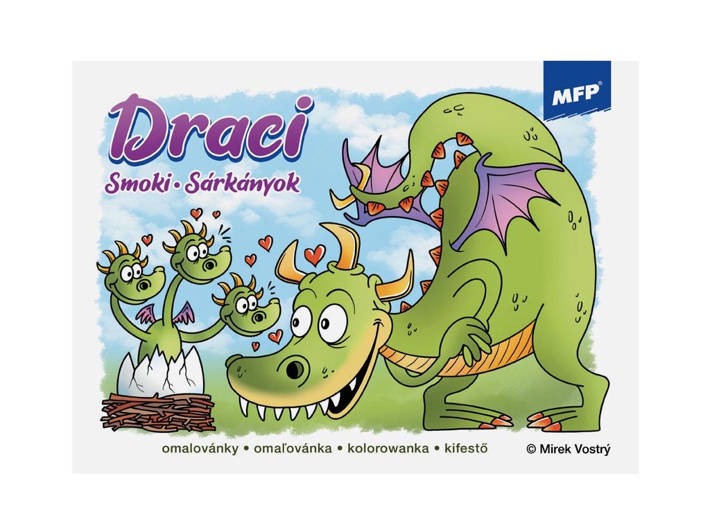 Detské omaľovánky MFP - Draci. Urobte si s deťmi pohodové popoludnie a vyfarbite si obrázok. Tieto maľovanky sú jednoduché s veľkými obrázkami, takže sú vhodné aj pre najmenšie deti. Vyfarbovanie obrázkov pomôže rozvíjať celý rad zručností a schopností, najmä má veľký vplyv na jemnú motoriku. U nás si môžete kúpiť aj kvalitné farebné pastelky. Ilustroval: M. Vostrý Formát omaľovánky: A5 Počet predlôh k vymaľovaniu: 8 (draci) Počet strán: 16 VAROVANIE: Nevhodné pre deti do 3 rokov. Nebezpečie vdýchnutia a prehltnutia malých častíc. Uvedená cena je za 1 ks.Dodatočné parametre