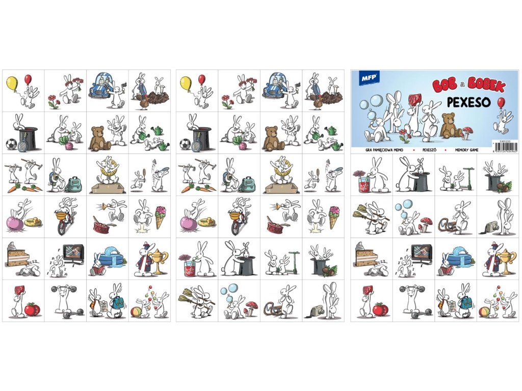 Pexeso s motívmi Boba a Bobka, obľúbených králikov z českého animovaného seriálu. Pexeso je tradičná stolová hra, ktorá sa používa na precvičenie pamäte a koncentrácie. Hra rozvíja schopnosť zapamätať si, kde sa jednotlivé obrázky nachádzajú, a podporuje tak kognitívne schopnosti, najmä pamäť a sústredenosť. Pexeso je obľúbené medzi deťmi, ale aj dospelými, pretože je zábavné a ľahko pochopiteľné. NÁVOD NA HRU PEXESO: Pexeso môžu hrať minimálne dvaja hráči. Všetky vystrihnuté karty sa zamiešajú a rozložia obrázkom nadol do štvorca 8 x 8. Nesmie sa pritom pozerať na obrázok. Hráči si určia poradie hry. Hráči otáčajú vždy dve karty s cieľom nájsť dvojice s rovnakými obrázkami. Ak hráč nájde dvojicu, ponechá si ju a pokračuje v ťahu. Ak nie, karty sa otočia späť obrázkom nadol a hrá ďalší hráč. Cieľom hry je nazbierať čo najviac dvojíc, a tak sa stať víťazom. PAPIER: krieda matná 350 g + lamino lesk 1/1 VEĽKOSŤ HRACÍCH KARIET: 51 x 51 cm UPOZORNENIE: Nevhodné pre deti do 3 rokov. Nebezpečenstvo vdýchnutia a prehltnutia malých častíc. Uvedená cena je za 1 ks.Dodatočné parametre