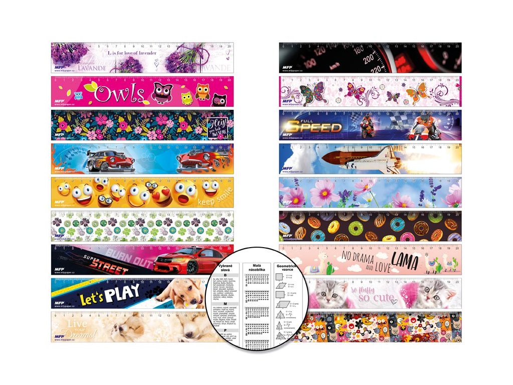Papierová záložka do knihy. Na jednej strane pravítko a obrázok, z druhej strany pomôcka - ťahák: násobilka, vymenované slová, matematické a fyzikálne vzorce. Dodávame v mixe po 18 ks podľa skladovej zásoby. Uvedená cena je za 1 ks.Dodatočné parametre