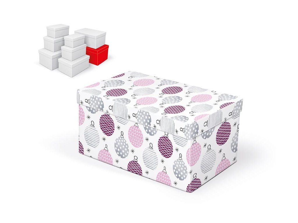 Vianočná darčeková krabička s rozmermi 30 x 19 x 15 cm Darčeková krabička s motívom vianočných ozdôb. Ideálna pre rýchle a ľahké zabalenie vianočných darčekov. Dodávame iba v sete 8 darčekových krabičiek, ktoré sú v rovnakom dizajne, ale v rôznych veľkostiach. Pri vložení do košíka sa automaticky vložia aj ostatné krabičky, tak aby ste mali v košíku vždy celý, kompletný set. Uvedená cena je za 1 ks. Materiál: 1,5 mm kartón, potiahnutý luxusným papierom Set obsahuje tieto krabice: 5370716 Krabica darčeková vianočná B-V003-A 16x10x8 cm 5370717 Krabica darčeková vianočná B-V003-B 18x11x9 cm 5370718 Krabica darčeková vianočná B-V003-C 20x12x10 cm 5370719 Krabica darčeková vianočná B-V003-D 22x14x11 cm 5370720 Krabica darčeková vianočná B-V003-E 24x16x12 cm 5370721 Krabica darčeková vianočná B-V003-F 26x17x13 cm 5370722 Krabica darčeková vianočná B-V003-G 28x18x14 cm 5370723 Krabica darčeková vianočná B-V003-H 30x19x15 cmDodatočné parametre