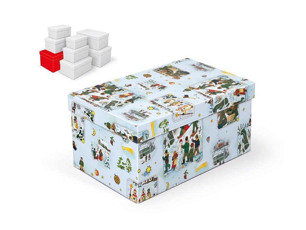 Vianočná darčeková krabička s motívmi Josefa Ladu s rozmermi 28 x 18 x 14 cm Vytvorte si doma atmosféru klasických slovenských Vianoc. Dodávame iba v sete 8 darčekových krabičiek, ktoré sú v rovnakom dizajne, ale v rôznych veľkostiach. Pri vložení do košíka sa automaticky vložia aj ostatné krabičky, tak aby ste mali v košíku vždy celý, kompletný set. Uvedená cena je za 1 ks. Materiál: 1,5 mm kartón, potiahnutý luxusným papierom Set obsahuje tieto krabice: 5370762 Krabica darčeková vianočná B-V005-AL 16x10x8 cm 5370763 Krabica darčeková vianočná B-V005-BL 18x11x9 cm 5370764 Krabica darčeková vianočná B-V005-CL 20x12x10 cm 5370765 Krabica darčeková vianočná B-V005-DL 22x14x11 cm 5370766 Krabica darčeková vianočná B-V005-EL 24x16x12 cm 5370767 Krabica darčeková vianočná B-V005-FL 26x17x13 cm 5370768 Krabica darčeková vianočná B-V005-GL 28x18x14 cm 5370769 Krabica darčeková vianočná B-V005-HL 30x19x15 cmDodatočné parametre