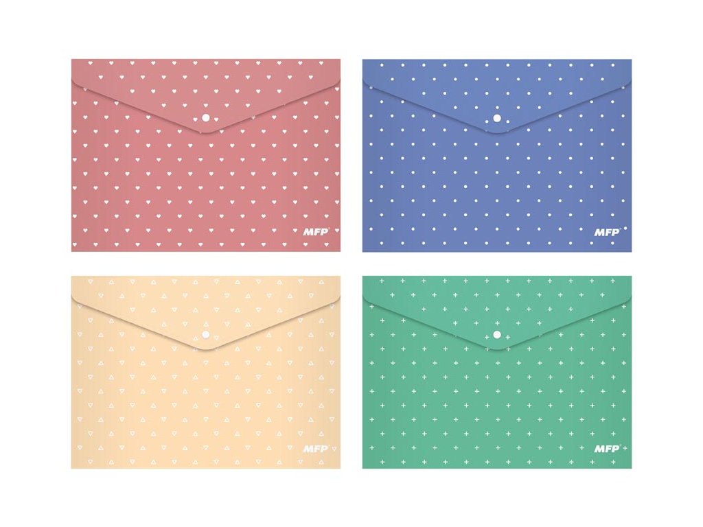 Zložka A4 z PolyPropylénu, ktorá sa zatvára pomocou cvoku. Zložka slúži ako pomocník na triedenie a ukladanie dokumentov, aby ste ich mali vždy pohromade. MATERIÁL: PP HRÚBKA MATERIÁLU: 0,21 mm FARBA: béžová, zelená, modrá, staroružová POTLAČ: srdiečka, bodky, trojuholníky, plusy Dodávame v mixe 4 ks podľa skladových zásob. Uvedená cena je za 1 ks.Dodatočné parametre
