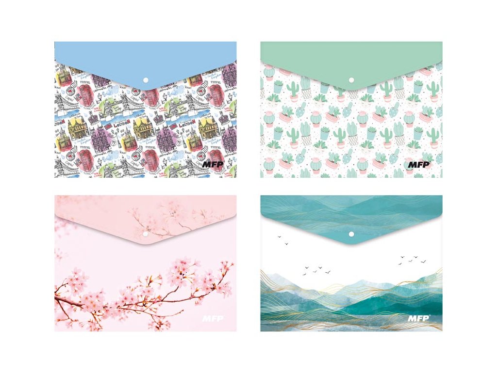Zložka z PolyPropylénu, ktorá sa zatvára pomocou cvoku, vo formáte A5. Zložka slúži ako pomocník na triedenie a ukladanie dokumentov, takže ich budete mať vždy pohromade. MATERIÁL: PP SILA MATERIÁLU: 0,21 mm POTLAČ: Londýn, kaktusy, kvety, vlny Dodávame v mixe po 4 ks podľa skladovej zásoby. Uvedená cena je za 1 ks.Dodatočné parametre