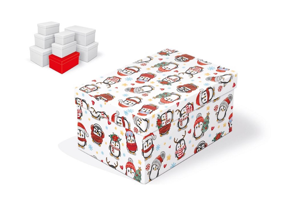 Vianočná darčeková krabička s rozmermi 24 x 16 x 12 cm Darčeková krabička s detským, vianočným motívom tučniakov.Dodávame iba v sete 8 darčekových krabičiek, ktoré sú v rovnakom dizajne, ale rôznych veľkostiach. Pri vložení do košíka sa automaticky vložia aj ostatné krabičky, tak aby ste mali v košíku vždy celý, kompletný set. Cena je uvedená za 1 ks. Materiál: 1,5 mm kartón, potiahnutý papierom s potlačou Súprava obsahuje tieto krabice: 5371038 Darčeková krabička B-V009-A 16x10x8 cm 5371039 Darčeková krabička B-V009-B 18x11x9 cm 5371040 Darčeková krabička B-V009-C 20x12x10 cm 5371041 Darčeková krabička B-V009-D 22x14x11 cm 5371042 Darčeková krabička B-V009-E 24x16x12 cm 5371043 Darčeková krabička B-V009-F 26x17x13 cm 5371044 Darčeková krabička B-V009-G 28x18x14 cm 5371045 Darčeková krabička B-V009-H 30x19x15 cmDodatočné parametre