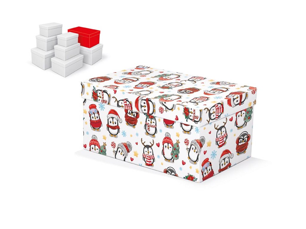 Vianočná darčeková krabička s rozmermi 26 x 17 x 13 cm Darčeková krabička s detským, vianočným motívom tučniakov.Dodávame iba v sete 8 darčekových krabičiek, ktoré sú v rovnakom dizajne, ale rôznych veľkostiach. Pri vložení do košíka sa automaticky vložia aj ostatné krabičky, tak aby ste mali v košíku vždy celý, kompletný set. Cena je uvedená za 1 ks. Materiál: 1,5 mm kartón, potiahnutý papierom s potlačou Sada obsahuje tieto krabice: 5371038 Darčeková krabička B-V009-A 16x10x8 cm 5371039 Darčeková krabička B-V009-B 18x11x9 cm 5371040 Darčeková krabička B-V009-C 20x12x10 cm 5371041 Darčeková krabička B-V009-D 22x14x11 cm 5371042 Darčeková krabička B-V009-E 24x16x12 cm 5371043 Darčeková krabička B-V009-F 26x17x13 cm 5371044 Darčeková krabička B-V009-G 28x18x14 cm 5371045 Darčeková krabička B-V009-H 30x19x15 cmDodatočné parametre