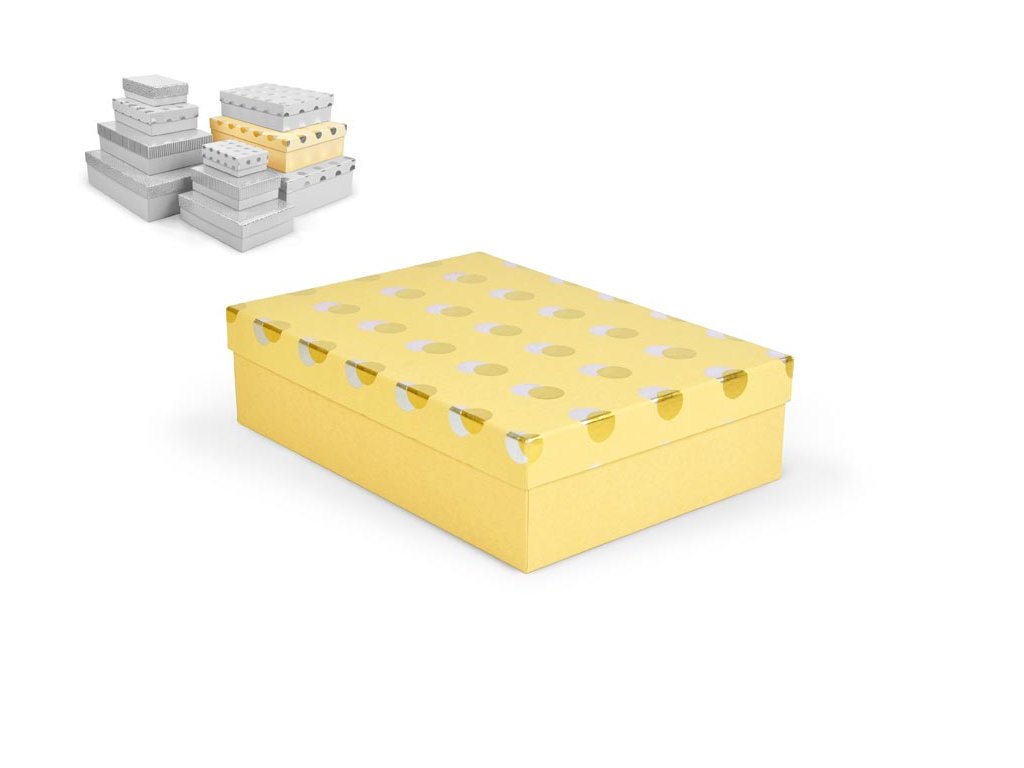 Celoročná darčeková krabička s rozmermi 33 x 23,5 x 9 cm NÁHODNÝ MIX Darčeková krabička v žltej farbe s rôznymi vzormi, ako sú bodky, pruhy alebo štruktúrovaný povrch. Vhodná na slávnostné príležitosti, dekoratívne účely, balenie osobných darčekov alebo na uloženie rôznych drobností. Po pridaní jednej krabičky do košíka sa automaticky pridá celá súprava, ktorá obsahuje krabičky s rôznymi vzormi a veľkosťami. Táto variabilita Vám zaručuje, že budete mať krabičky vhodné na rôzne príležitosti a typy darčekov. Krabičky sú elegantne navrhnuté a navzájom ladia svojimi farbami a vzormi, čím vytvárajú harmonickú súpravu ideálnu na každú príležitosť. Materiál: 1,5 mm kartón, potiahnutý papierom s potlačou Súprava obsahuje tieto krabice: 5371125 Darčeková krabica D-L003-A 14,5x10x5cm 5371126 Darčeková krabica D-L003-B 17x12x5,5cm 5371127 Darčeková krabica D-L003-C 19x13,5x6cm 5371128 Darčeková krabica D-L003-D 22x16x6,5cm 5371129 Darčeková krabica D-L003-E 24,5x17,5x7cm 5371130 Darčeková krabica D-L003-F 27,5x19,5x7,5cm 5371131 Darčeková krabica D-L003-G 29x21x8cm 5371132 Darčeková krabica D-L003-H 33x23,5x9cm 5371133 Darčeková krabica D-L003-I 35x25x10cm 5371134 Darčeková krabica D-L003-J 37x27x11cm Uvedená cena je za 1 ks.Dodatočné parametre