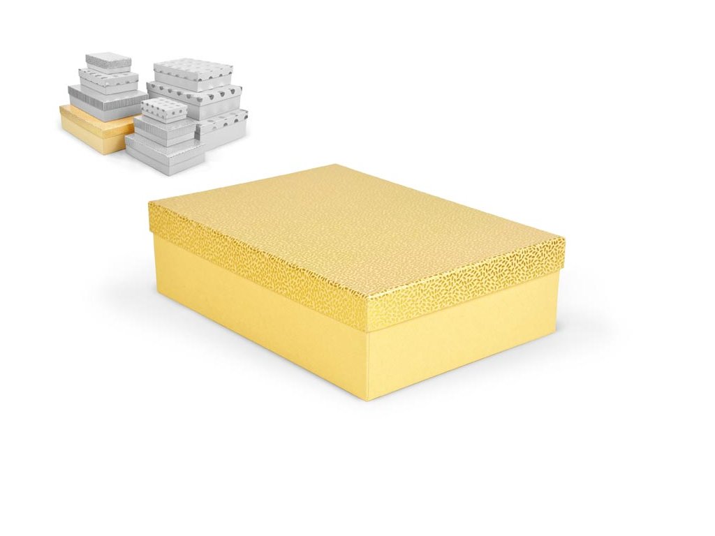 Celoročná darčeková krabička s rozmermi 35 x 25 x 10 cm NÁHODNÝ MIX Darčeková krabička v žltej farbe s rôznymi vzormi, ako sú bodky, pruhy alebo štruktúrovaný povrch. Vhodná na slávnostné príležitosti, dekoračné účely, balenie osobných darčekov alebo na uloženie rôznych drobností. Po pridaní jednej krabičky do košíka sa automaticky pridá celá sada, ktorá obsahuje krabičky s rôznymi vzormi a veľkosťami. Táto variabilita Vám zaručuje, že budete mať krabičky vhodné na rôzne príležitosti a typy darčekov. Krabičky sú elegantne navrhnuté a navzájom ladia svojimi farbami a vzormi, čím vytvárajú harmonickú súpravu ideálnu na každú príležitosť. Materiál: 1,5 mm kartón, potiahnutý papierom s potlačou Súprava obsahuje tieto krabice: 5371125 Darčeková krabica D-L003-A 14,5x10x5cm 5371126 Darčeková krabica D-L003-B 17x12x5,5cm 5371127 Darčeková krabica D-L003-C 19x13,5x6cm 5371128 Darčeková krabica D-L003-D 22x16x6,5cm 5371129 Darčeková krabica D-L003-E 24,5x17,5x7cm 5371130 Darčeková krabica D-L003-F 27,5x19,5x7,5cm 5371131 Darčeková krabica D-L003-G 29x21x8cm 5371132 Darčeková krabica D-L003-H 33x23,5x9cm 5371133 Darčeková krabica D-L003-I 35x25x10cm 5371134 Darčeková krabica D-L003-J 37x27x11cm Uvedená cena je za za 1 ks.Dodatočné parametre