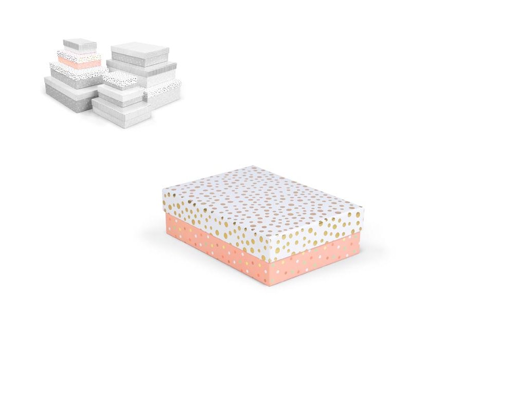 Celoročná darčeková krabička s rozmermi 22 x 16 x 6,5 cm NÁHODNÝ MIX Darčeková krabička v kombinácii pastelových farieb s rôznymi vzormi, ako sú bodky, prúžky alebo štruktúrovaný povrch. Vzory a farby sú zladené tak, aby vytvárali harmonický a elegantný vzhľad. Vhodná na slávnostné príležitosti, dekoratívne účely, balenie osobných darčekov alebo na uloženie rôznych drobností. Po pridaní jednej krabičky do košíka sa automaticky pridá celá súprava, ktorá obsahuje krabičky s rôznymi vzormi a veľkosťami. Táto variabilita Vám zaručuje, že máte k dispozícii krabičky vhodné na rôzne príležitosti a typy darčekov. Krabičky sú elegantne navrhnuté a navzájom ladia svojimi farbami a vzormi, čím vytvárajú harmonickú súpravu ideálnu na každú príležitosť. Materiál: 1,5 mm kartón, potiahnutý papierom s potlačou Súprava obsahuje tieto krabice: 5371135 Darčeková krabica D-L004-A 14,5x10x5cm 5371136 Darčeková krabica D-L004-B 17x12x5,5cm 5371137 Darčeková krabica D-L004-C 19x13,5x6cm 5371138 Darčeková krabica D-L004-D 22x16x6,5cm 5371139 Darčeková krabica D-L004-E 24,5x17,5x7cm 5371140 Darčeková krabica D-L004-F 27,5x19,5x7,5cm 5371141 Darčeková krabica D-L004-G 29x21x8cm 5371142 Darčeková krabica D-L004-H 33x23,5x9cm 5371143 Darčeková krabica D-L004-I 35x25x10cm 5371144 Darčeková krabica D-L004-J 37x27x11cm Uvedená cena je za 1 ks.Dodatočné parametre